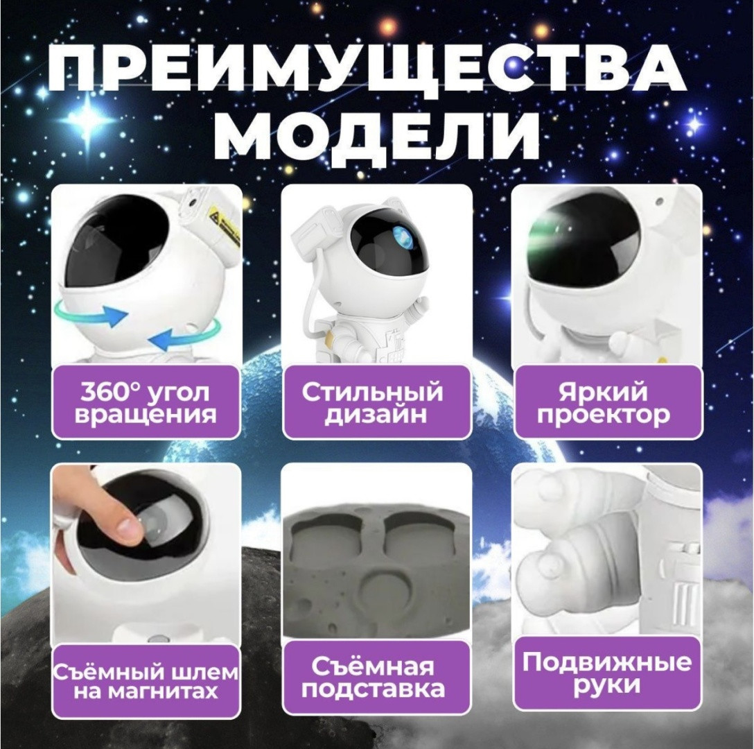 Ночник-звездное небо «Космонавт»В данный момент этот товар отсутствует в продаже. Возможно, у нас найдется аналогичный или похожий товар здесь. Ночник — проектор «Космонавт» наполнит пространство вашей комнаты чудесным светом звезд и галактики! Вы можете выбрать любой из 8-и видов сияния, голова астронавта вращается на 360 градусов- поможет удобно настраивать направление проекции. Размеры длина,ширина и высота 12 × 9 × 24 см, вес товара 600г. Управлять ночником можно с помощью кнопок или пульта дистанционного управления. Проектор имеет таймер выключения, который позволяет настроить продолжительность работы на 45/90 мин. |