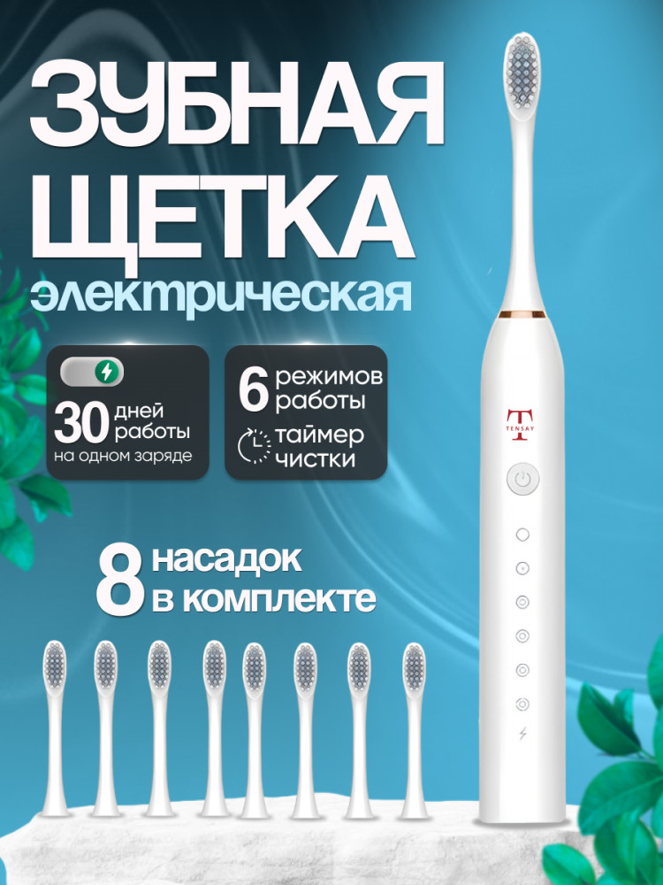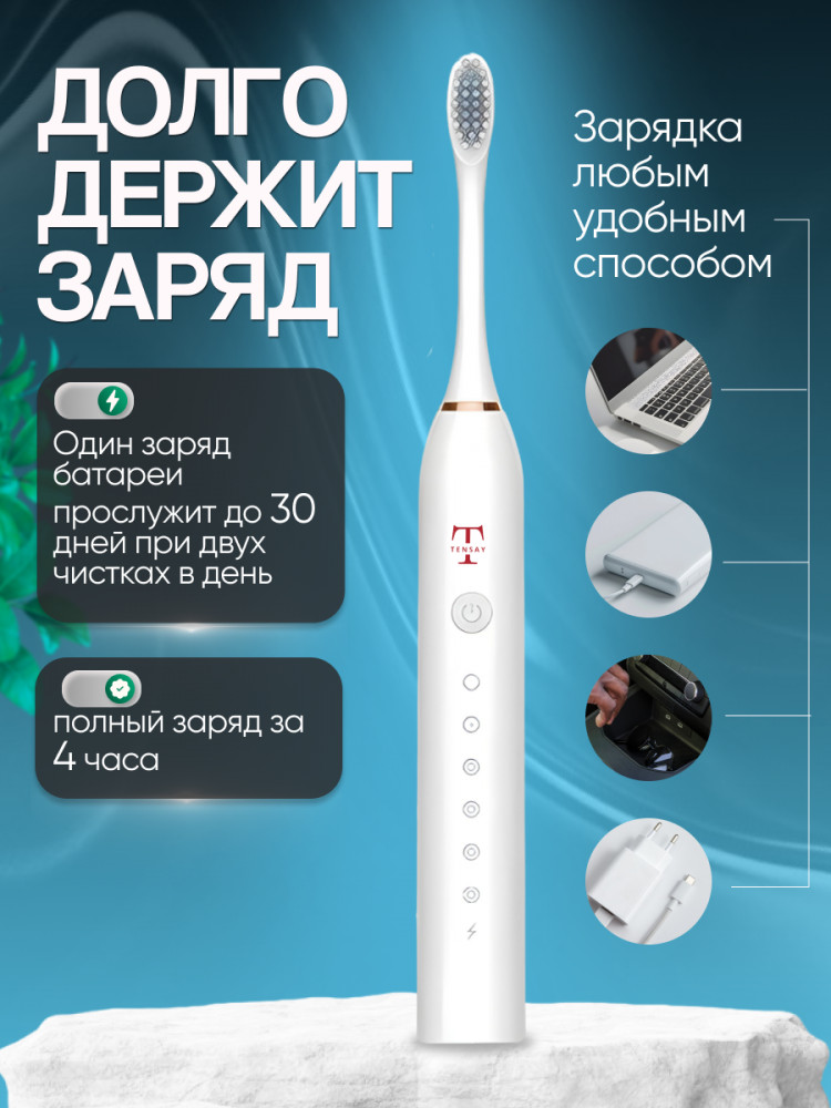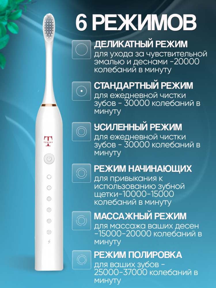 Представляем Вам электрическую зубную щетку казахстанского бренда «TENSAY» для красоты и здоровья зубов. Прибор имеет 6 режимов работы: 1. Деликатный режим; 2. Стандартный режим; 3. Усиленный режим; 4. Режим начинающих; 5. Массажный режим; 6. Режим полировка. Деликатный и щадящий (для чистки языка и чувствительной тонкой эмали) – для детей, беременных (будущих мам). Стандартный (ежедневная личная гигиена, удаление налета и зубного камня). Усиленный режим (не требует дорогой уходовой косметики и отбеливателей – используйте привычную зубную пасту и порошок). Режим начинающих – для тех, кто впервые пользуется электрической зубной щеткой. Массажный режим (предотвращает кровоточивость десен). Режим полировка - (для таких ортодонтических конструкций как импланты, вставные протезы, коронки и виниры, брекеты и элайнеры).