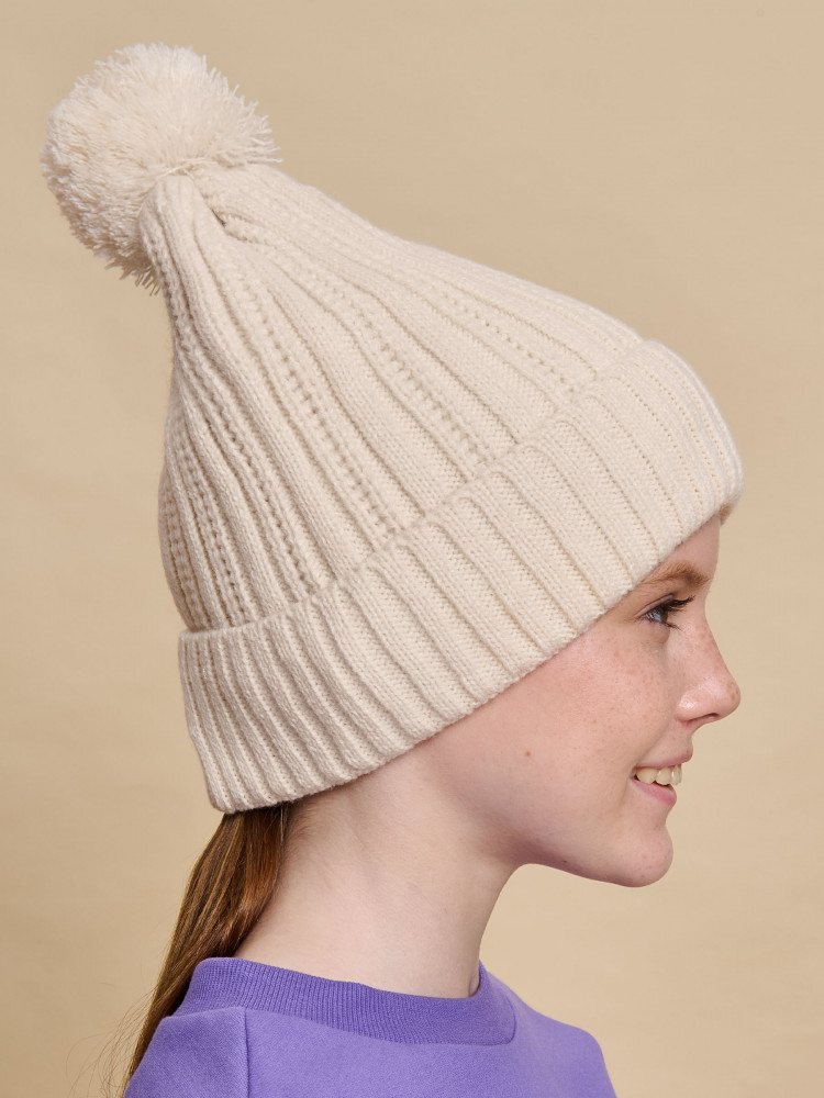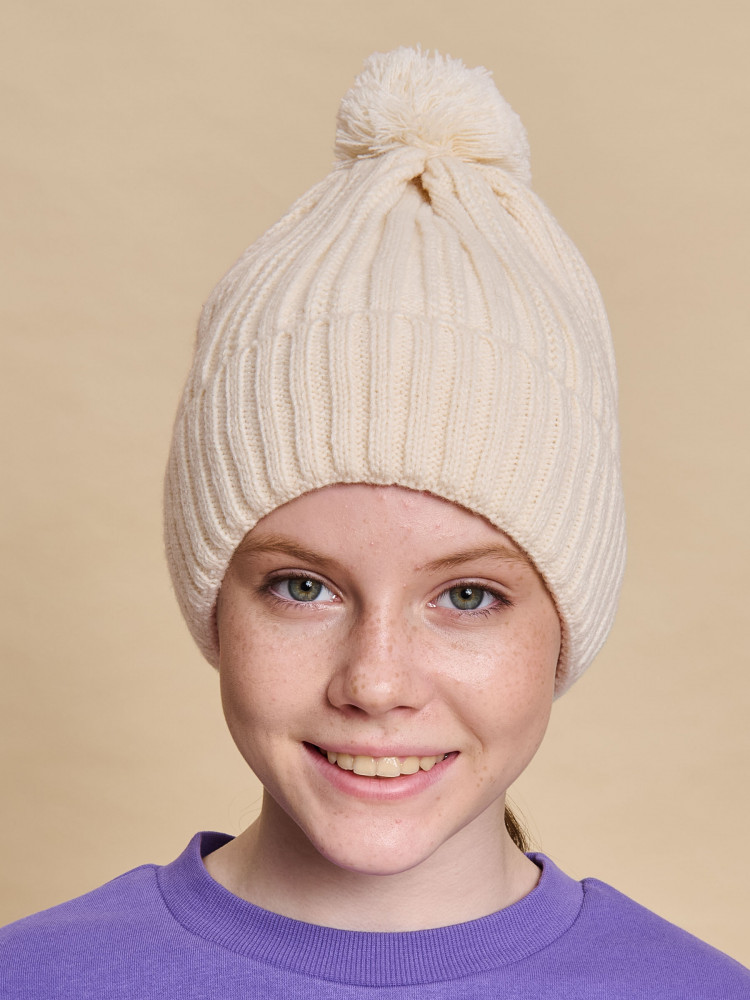 Стильная детская шапка с помпоном. Шапка для девочки и мальчика с отворотом и флисовой подкладкой выполнена изящной ажурной вязкой. Изделие изготовлено из 100% акрила — оно тёплое, имеет мягкую текстуру, прекрасно тянется. Шапка вязаная неприхотлива в уходе, не мнётся и сохраняет превосходный внешний вид в течение длительного времени. Благодаря великолепным терморегулирующим свойствам акрила модель подходит для носки в холода. Внутри подкладка из флиса — она приятна на ощупь и помогает шапке сохранять тепло. Шапка слегка вытянутой формы, небольшого объёма, она плотно прилегает к голове ребёнка и не сползает. Ажурная вязка изделия смотрится небанально и стильно. Шапка представлена в базовом молочном цвете, который подойдёт к любой верхней одежде. Помпон выполнен из ниток того же цвета, что и сама шапка. Модель идеальна для долгих прогулок и игр на улице. Отличный выбор для вашего ребёнка!
