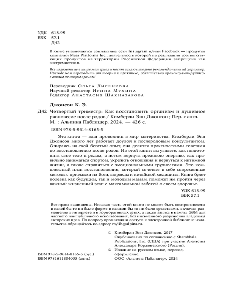 💳 Оплатить за товар можно при получении 🇰🇿 Есть бесплатная доставка по Казахстану от 1 дня 🎁 Копите бонусы с каждой покупки Эта книга — ваш проводник в мир материнства. Кимберли Энн Джонсон много лет работает доулой и послеродовым консультантом. Опираясь на свой богатый опыт, она делится практическими советами по восстановлению после родов. Из этой книги вы узнаете, как подготовить свое тело к родам, а потом вернуть прежнюю энергию, как правильно заниматься спортом, укрепить отношения и вернуться к интимной жизни, а также справиться с эмоциональными трудностями. Это комплексный план восстановления, который сочетает в себе современные методы с приемами из йоги, аюрведы и китайской медицины. |