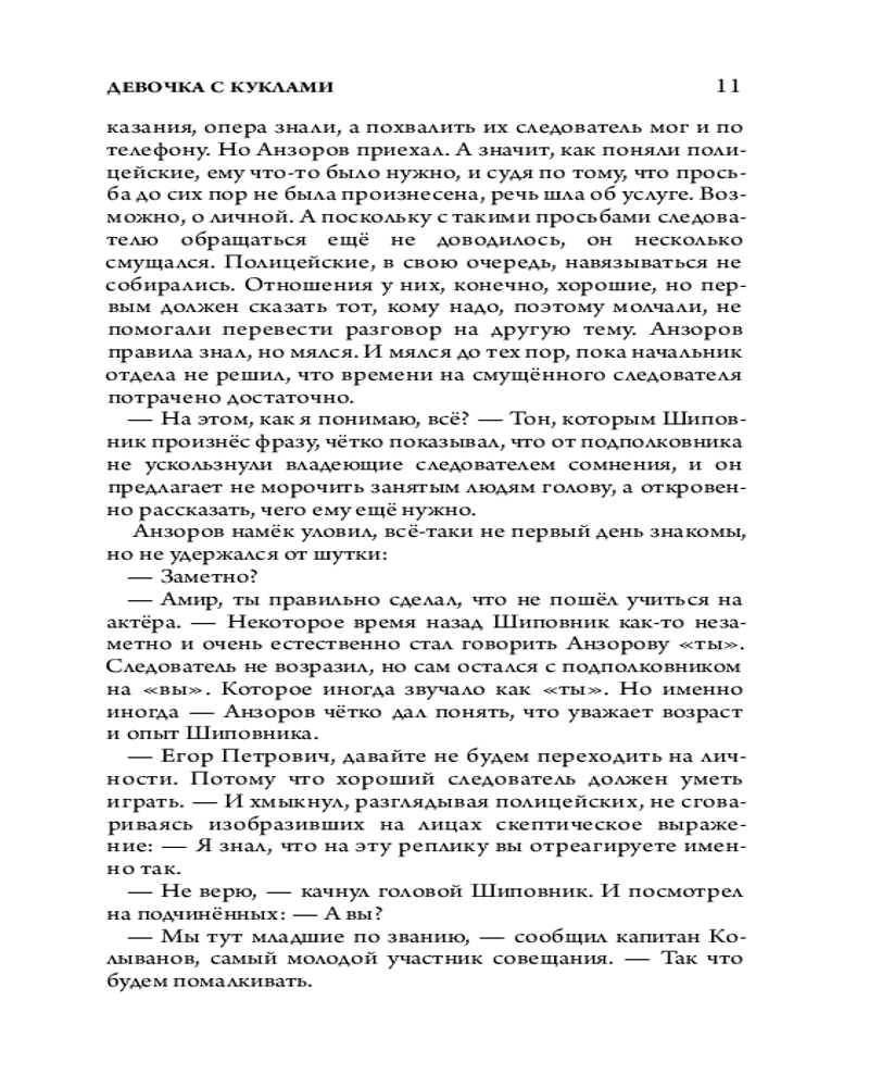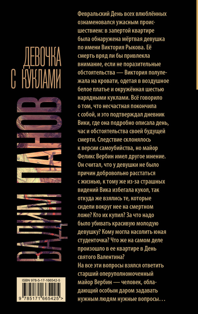 💳 Оплатить за товар можно при получении 🇰🇿 Есть бесплатная доставка по Казахстану от 1 дня 🎁 Копите бонусы с каждой покупки Серия: Настоящий триллер Февральский День всех влюблённых ознаменовался ужасным происшествием: в запертой квартире была обнаружена мёртвая девушка по имени Виктория Рыкова. Её смерть вряд ли бы привлекла внимание, если не поразительные обстоятельства — Виктория полулежала на кровати, одетая в воздушное белое платье и окружённая шестью нарядными куклами. Всё говорило о том, что несчастная покончила с собой, и это подтверждал дневник Вики, где она подробно описала день, час и обстоятельства своей будущей смерти. Следствие склонялось к версии самоубийства, но майор Феликс Вербин имел другое мнение. Он считал, что у девушки не было причин добровольно расстаться с жизнью, к тому же из-за страшных видений Вика избегала кукол, так откуда же взялись те, которые сидели вокруг нее на смертном ложе? Кто их купил? За что надо было убивать красивую молодую девушку? Кому могла насолить юная студенточка? Что же на самом деле произошло в ее квартире в День святого Валентина? На все эти вопросы взялся ответить старший оперуполномоченный майор Вербин — человек, обладающий особым даром задавать нужным людям нужные вопросы... |