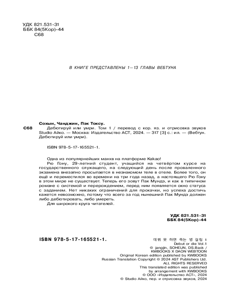 💳 Оплатить за товар можно при получении 🇰🇿 Есть бесплатная доставка по Казахстану от 1 дня 🎁 Копите бонусы с каждой покупки Серия: Вебтун. Дебютируй или умри Одна из популярнейших манхв на платформе Kakao! Рю Гону, 29-летний студент, учащийся на четвёртом курсе на государственного служащего, на следующий день после проваленного экзамена внезапно просыпается в незнакомом теле в отеле. Более того, он ещё и переместился во времени на три года назад, а настоящего Рю Гону в этом мире не существует. Теперь его зовут Пак Мундэ, и как в типичном романе с системой и перерождением, перед ним появляется окно статуса с заданием. Нет никаких ограничений для прокачки, но успеха достичь кажется невозможно, потому что всего за год нынешний Пак Мундэ должен либо дебютировать, либо умереть. Для широкого круга читателей. |