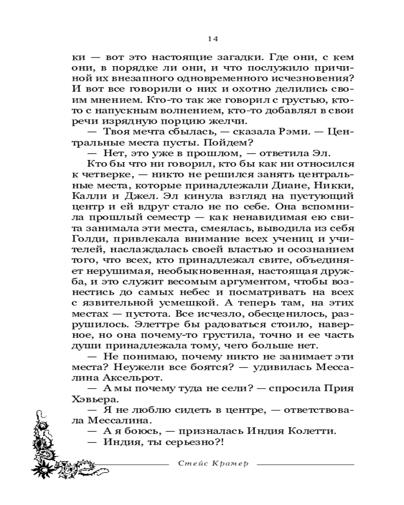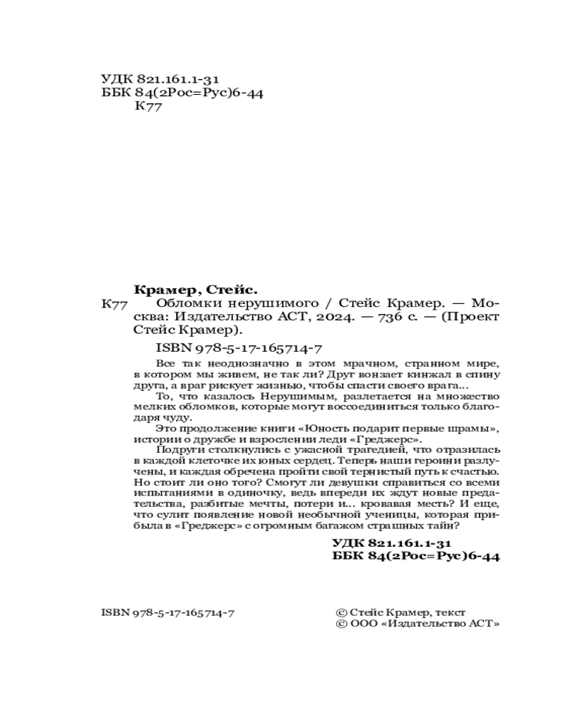 💳 Оплатить за товар можно при получении 🇰🇿 Есть бесплатная доставка по Казахстану от 1 дня 🎁 Копите бонусы с каждой покупки Серия: Проект Стейс Крамер Все так неоднозначно в этом мрачном, странном мире, в котором мы живем, не так ли? Друг вонзает кинжал в спину друга, а враг рискует жизнью, чтобы спасти своего врага... То, что казалось Нерушимым, разлетается на множество мелких обломков, которые могут воссоединиться только благодаря чуду. Это продолжение книги «Юность подарит первые шрамы», истории о дружбе и взрослении леди «Греджерс». Подруги столкнулись с ужасной трагедией, что отразилась в каждой клеточке их юных сердец. Теперь наши героини разлучены, и каждая обречена пройти свой тернистый путь к счастью. Но стоит ли оно того? Смогут ли девушки справиться со всеми испытаниями в одиночку, ведь впереди их ждут новые предательства, разбитые мечты, потери и... кровавая месть? И еще, что сулит появление новой необычной ученицы, которая прибыла в «Греджерс» с огромным багажом страшных тайн? |