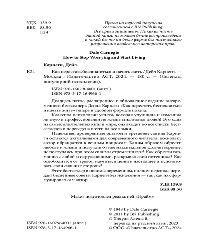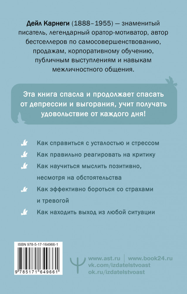 💳 Оплатить за товар можно при получении 🇰🇿 Есть бесплатная доставка по Казахстану от 1 дня 🎁 Копите бонусы с каждой покупки Серия: Легенды популярной психологии Двадцать пятое, расширенное и обновленное издание вневременного бестселлера Дейла Карнеги «Как перестать беспокоиться и начать жить» — классика, которая улучшила и изменила личную и профессиональную жизнь миллионов людей! Это одна из самых влиятельных книг в мире, она входит во все списки бестселлеров и переведена почти на все языки. Надежные, проверенные опытом и временем советы Карнеги остаются актуальными для современного читателя, поскольку автор обращается к вечным вопросам. Этот бестселлер в новом, современном, полном переводе передает бесценные советы Карнеги без искажения — так, как их сформулировал сам автор. |