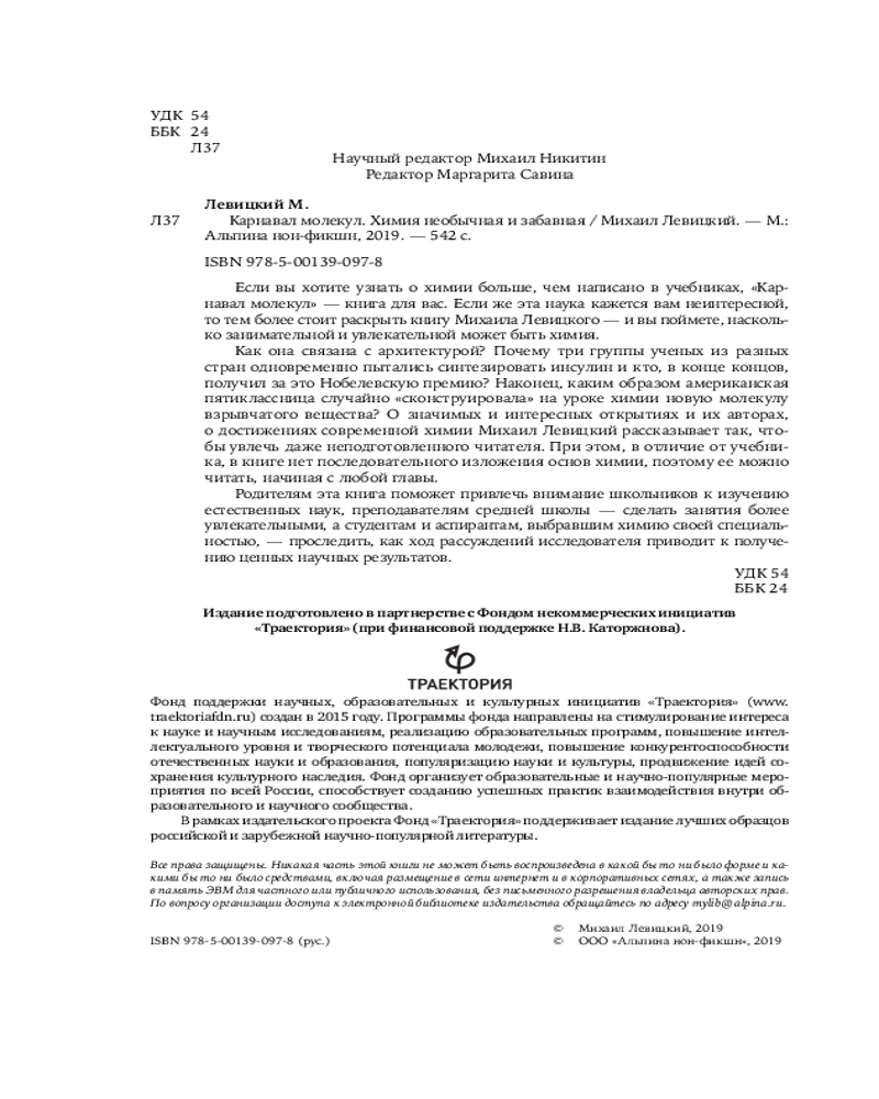 💳 Оплатить за товар можно при получении 🇰🇿 Есть бесплатная доставка по Казахстану от 1 дня 🎁 Копите бонусы с каждой покупки Серия: Alpina Popular Science Если вы хотите узнать о химии больше, чем написано в учебниках, «Карнавал молекул» — книга для вас. Если же эта наука кажется вам неинтересной, то тем более стоит раскрыть книгу Михаила Левицкого — и вы поймете, насколько занимательной и увлекательной может быть химия. |