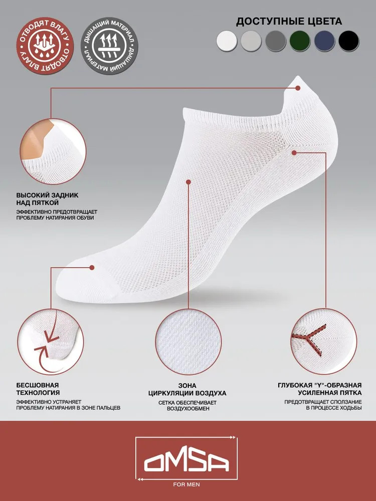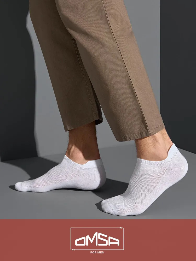 Носки мужские короткие Omsa Active 113 — dыполнены из высококачественного хлопка, который отлично пропускает воздух и подходит для чувствительной кожи. Специальное сетчатое переплетение обеспечивает сбалансированный воздухообмен. Завышенная пятка, удобная резинка и кеттельный (плоский) шов на мыске создают оптимальный комфорт и превосходное облегание. Добавление эластана и полиамида увеличивает износостойкость и прочность. Стильные, укороченные, лаконичные и практичные носки идеально сочетаются как со спортивной, так и с повседневной одеждой и обувью. Отличный подарок мужчине, папе, другу, парню на любой праздник. Идеально подойдут для теплого весеннего и летнего времени года.