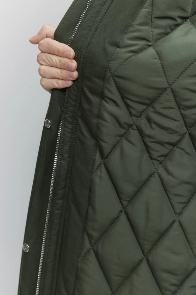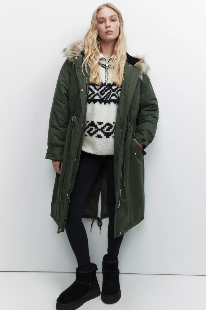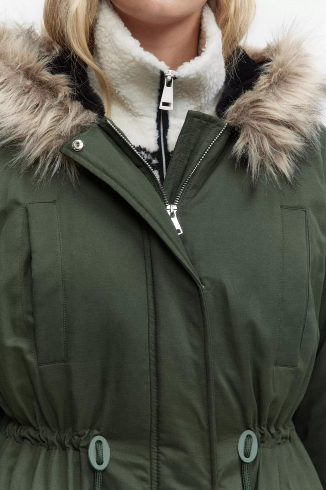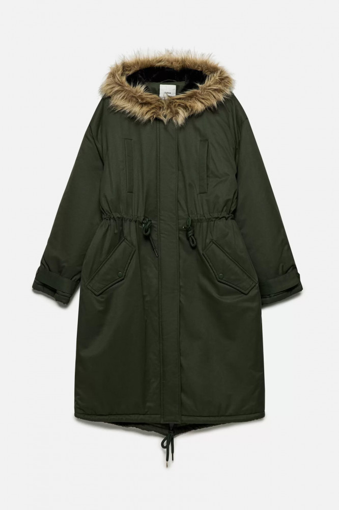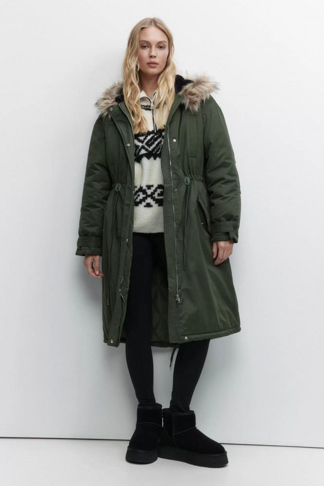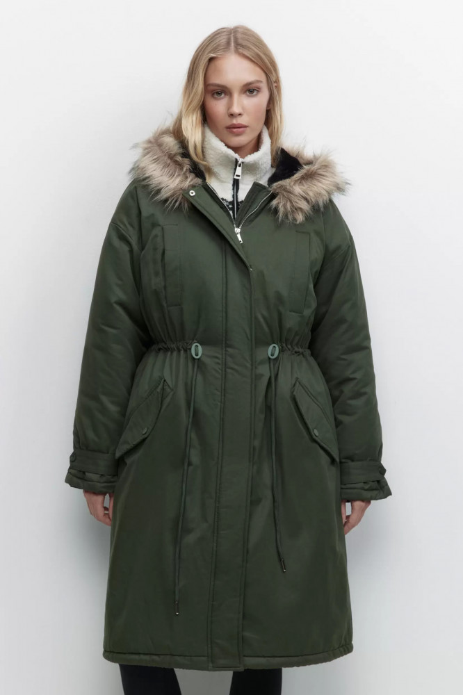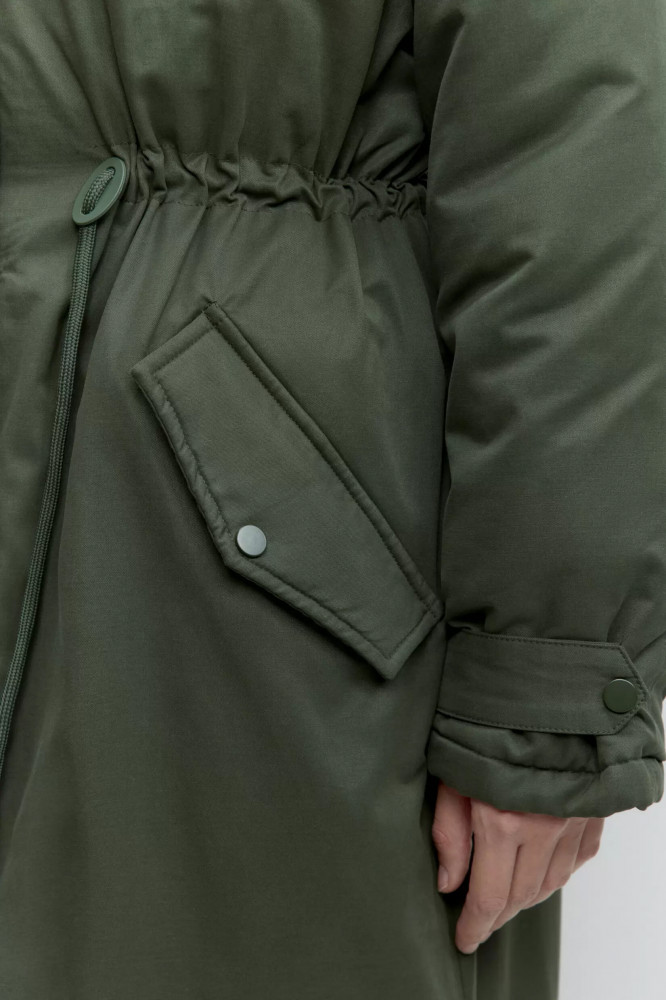 Куртка-парка длинная утепленная с опушкой и капюшоном. Длинная женская куртка-парка свободного прямого кроя из плотной плащевой ткани с искусственным утеплителем (синтепон). Объемный несъемный капюшон с меховой подкладкой и опушкой для защиты от ветров и морозов. Длинные свободные рукава с декоративными ремешками на кнопке. Два прорезных нагрудных кармана без застежки, два боковых накладных кармана с клапаном и застежкой на кнопки. Застежка на молнию и кнопки по всей длине спереди, вшитый шнурок со стопперами на поясе. Удлиненный сзади нижний край с разрезом и шнурками. Однотонное темно-зеленое утепленное пальто с меховой опушкой для женщин. Теплая женская парка с меховым воротником — стильное спасение на прохладную осень: сочетайте ее с удобными брюками или джинсами и создавайте уютные кэжуал-аутфиты в школу, университет, офис или просто на каждый день.