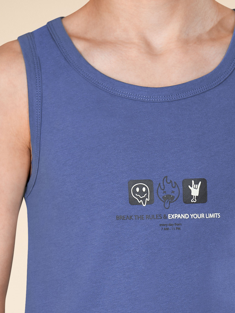 Майка детская из 100% хлопка для мальчика. Натуральный состав ткани обеспечивает изделию мягкость, гипоаллергенность и воздухопроницаемость. Майка детская для мальчиков комфортно сидит по фигуре, её можно надевать под рубашку, джемпер, свитер. Горловина и проймы изделия отделаны пайпингом в тон — они хорошо держат форму, надолго сохраняют аккуратный внешний вид. Хлопковая майка синего цвета украшена забавным принтом в готическом стиле, надпись переводится: «Нарушай правила и расширяй границы своих возможностей каждый день с 7:00 до 23:00». Фишка модели — принт светится в темноте! Такая особенность непременно понравится любому ребёнку. Майка детская для мальчика неприхотлива в уходе. Принт эластичный и мягкий, без проблем переносит частые стирки. Нательная майка для мальчика подходит для повседневной носки, отдыха, а также для сна и дома.