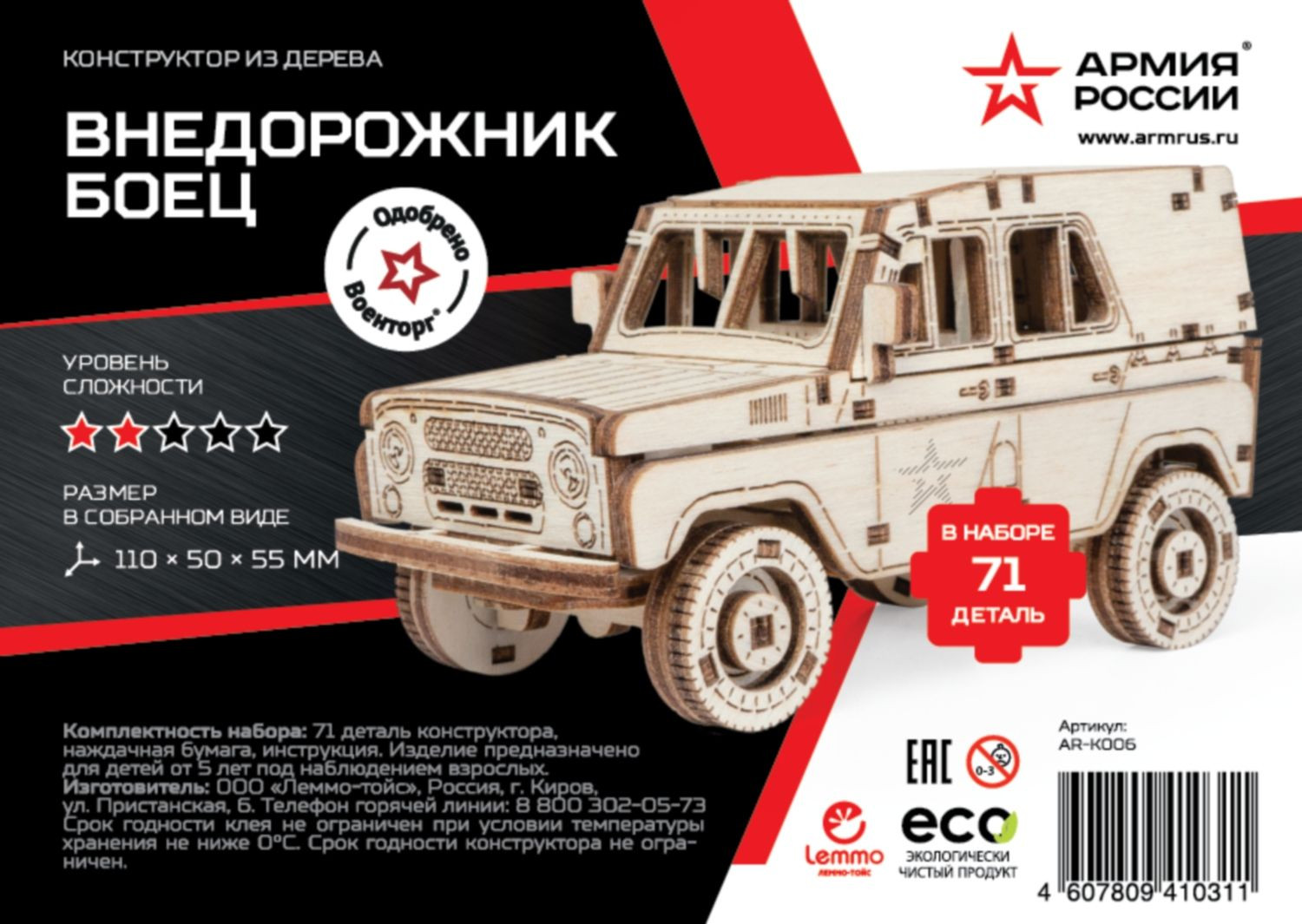Армия России Конструктор внедорожник «Боец»В данный момент этот товар отсутствует в продаже. Возможно, у нас найдется аналогичный или похожий товар здесь. Деревянный конструктор и сборная модель из дерева Автомобиль Внедорожник «Боец» Армия России для детей и взрослых. Все детали выполнены из качественной древесины и имеют сильный насыщенный запах дерева. Готовы к сборке. Детали находятся на специальных плашках и необходимо только выдавить пальцем нужную деталь. |