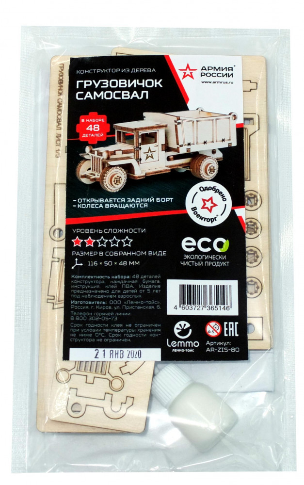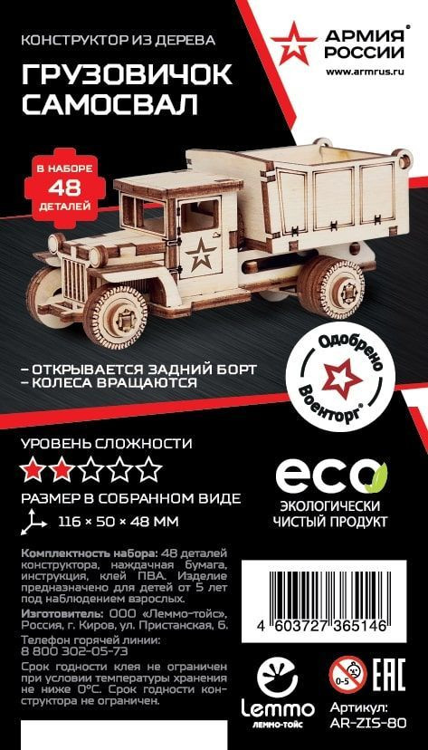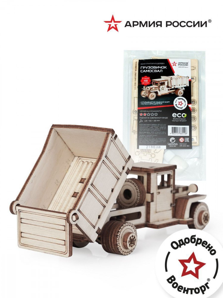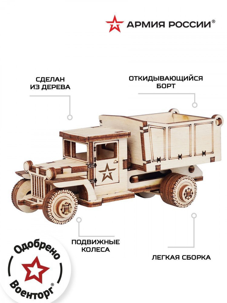 Армия России Конструктор «Самосвал»В данный момент этот товар отсутствует в продаже. Возможно, у нас найдется аналогичный или похожий товар здесь. Экологически чистые, развивающие конструкторы помогут вашему ребенку развить мелкую моторику рук, воображение, пространственное мышление, логику и предметное моделирование. Все детали выполнены из качественной древесины и имеют сильный насыщенный запах дерева. Наборы укомплектованы клеем ПВА и наждачной бумагой. Любой конструктор после сборки можно раскрасить акриловыми и гуашевыми красками, но даже без этого в результате получается полноценная красивая игрушка с подвижными элементами. Набор Советский грузовик ЗИС-5ВБ с кузовом подходит для ребенка от 5 лет. У собранной модели вращаются колеса. |