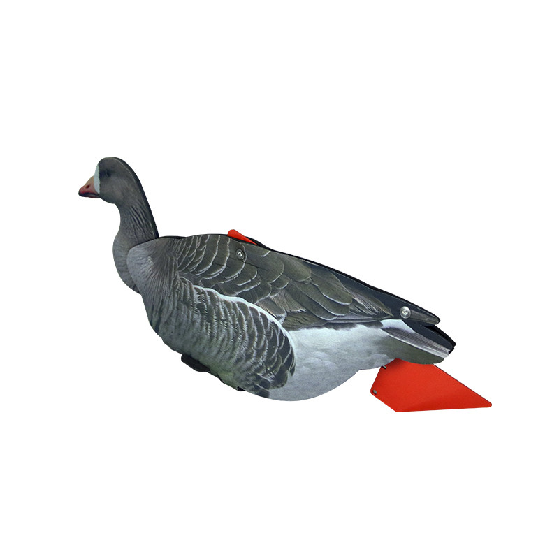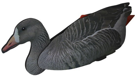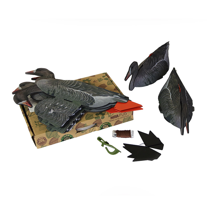 Чучела «Белолобого гуся» NRA FUD — первые универсальные, трехмерные чучела, которые могут принимать разные позы и раскладываться всего лишь в 3 этапа. Возможность придания разных поз отличает продукцию NRA FUD от прочих аналогов. Раскраска гуся доведена до уровня схожести, безупречно привлекающего живых птиц. Все чучела Белолобого гуся минимум на 10% больше соответствующих настоящих птиц и имеют правильные пропорции. Материал неопрен способен выдерживать деформацию и возвращать первоначальную форму: чучела можно забивать в мерзлую почву, лед, пни и бревна; можно прострелить и дробь пройдет насквозь — чучело не потеряет функциональность.