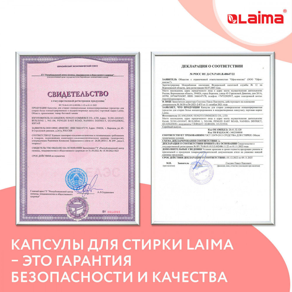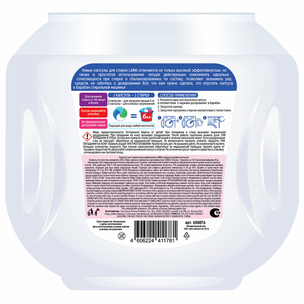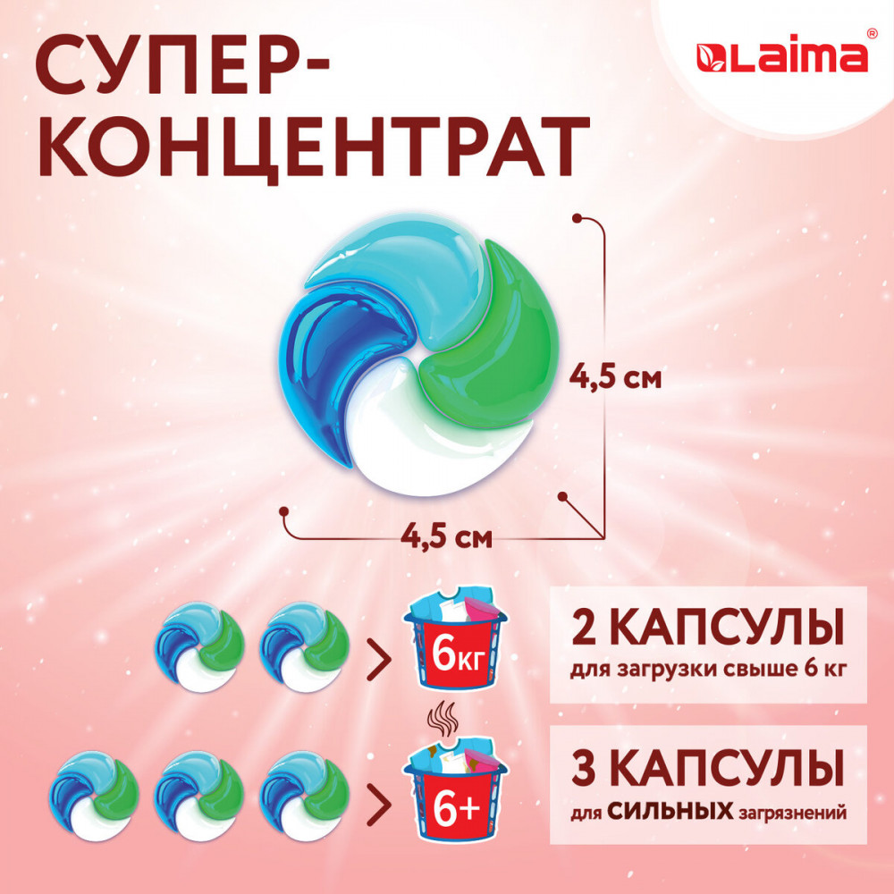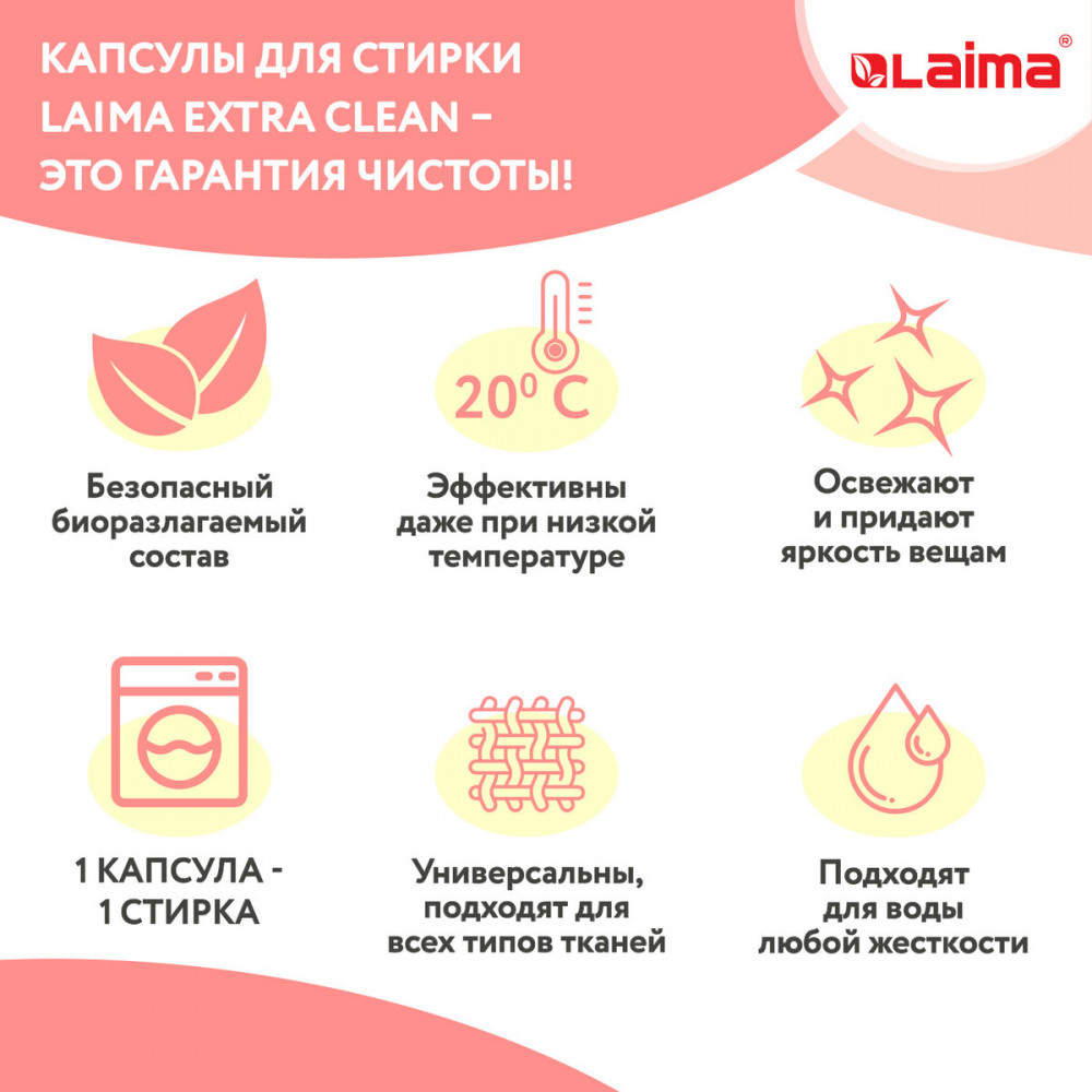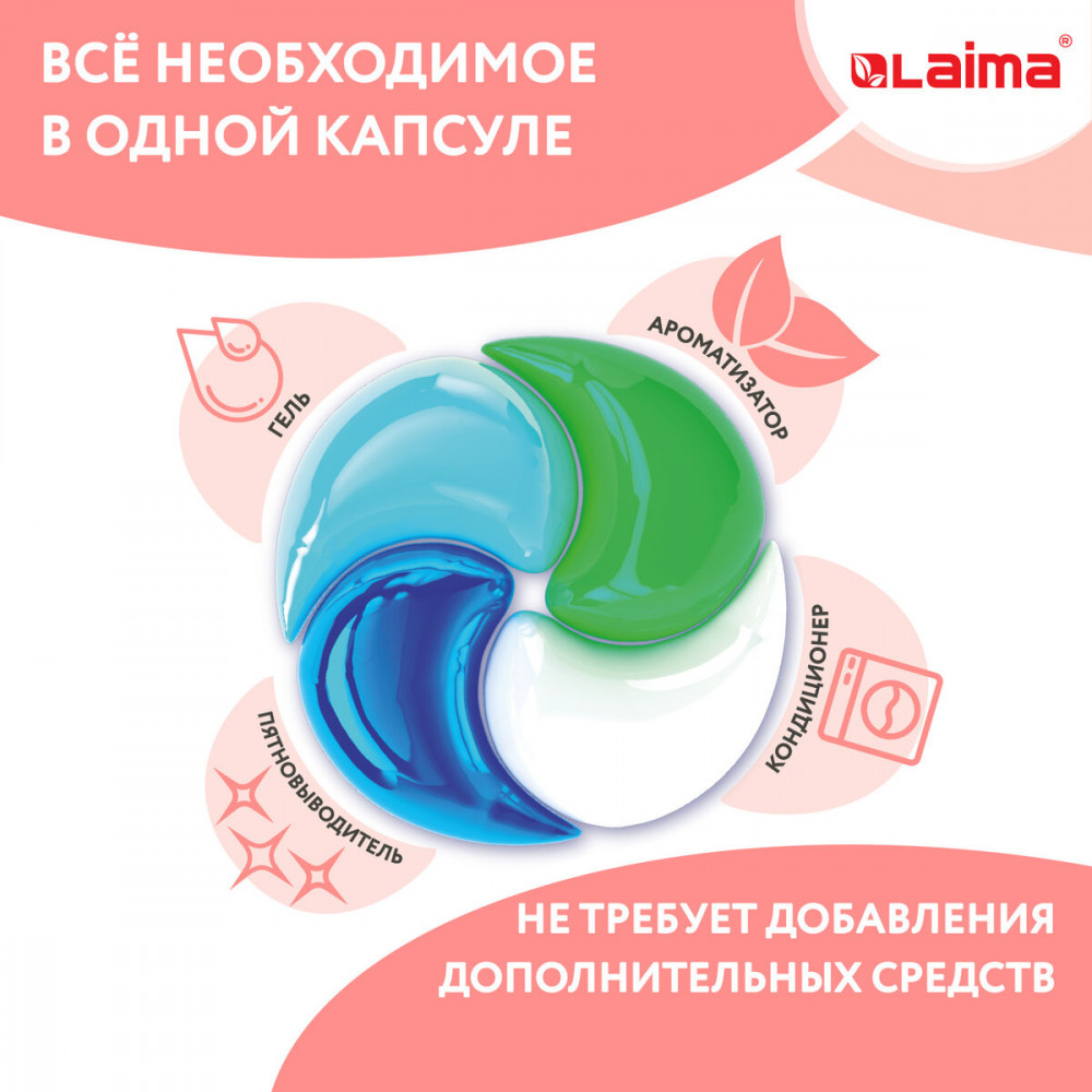 Новые капсулы для стирки Laima отличаются не только высокой эффективностью, но также и простотой использования! Действующие компоненты сбалансированы по составу и сочетаемости между собой. Они позволяют использовать минимум средств для стирки даже при максимальной загрузке стиральной машины Компактный формат позволяет дозировать количество капсул на стирку при полной и частичной загрузке барабана. Уникальная формула, содержащая смягчающие масла, позаботится о ткани даже без использования дополнительного кондиционера!