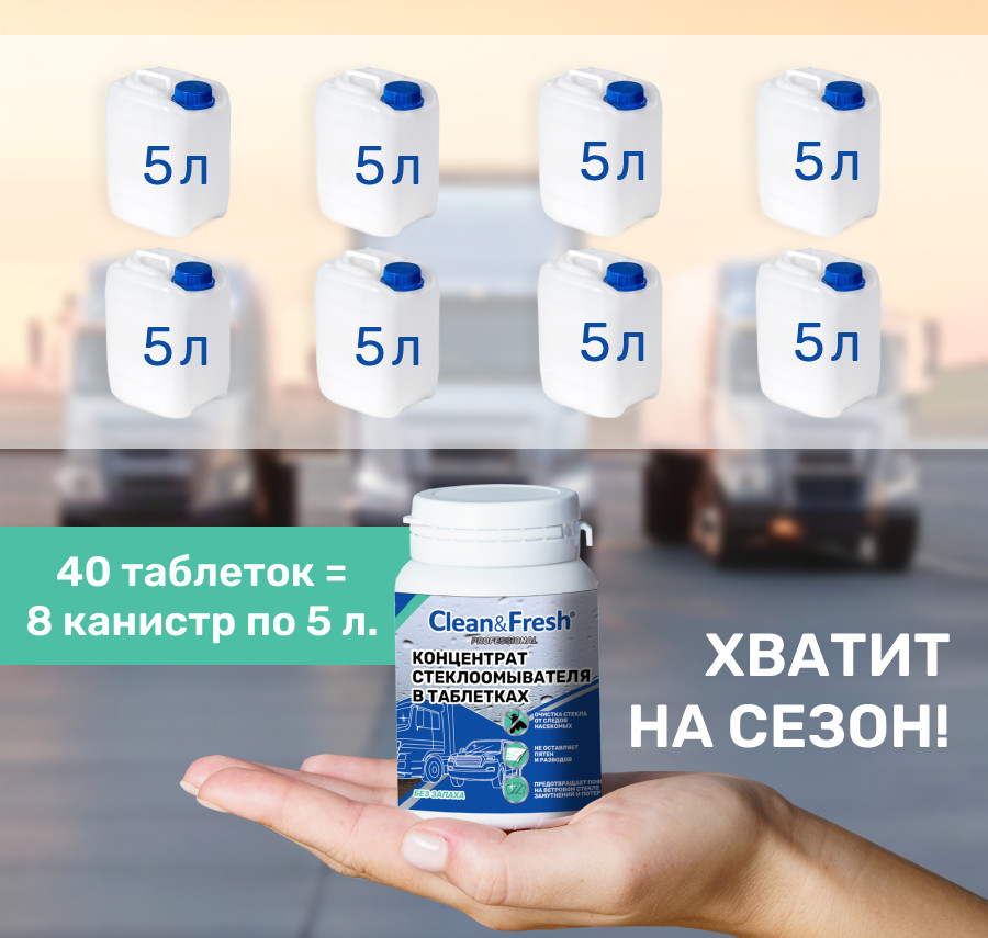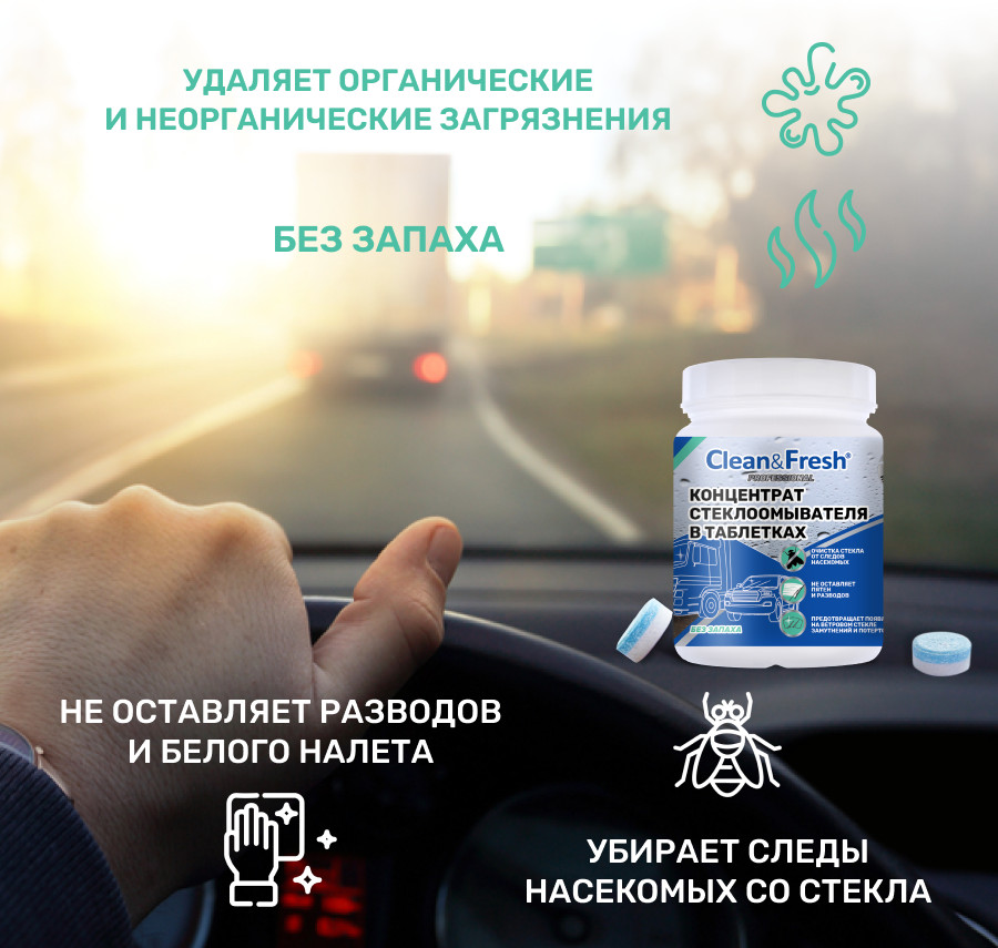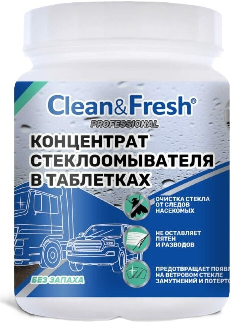 Концентрат стеклоомывателя в таблетках Clean&Fresh — это удобное и эффективное решение для быстрого и качественного удаления дорожной грязи, следов насекомых и жирного налета со стекол автомобиля. В основе концентрата лежат современные активные вещества, которые обеспечивают высокую моющую способность и предотвращают образование разводов и известковых отложений на стекле и форсунках стеклоочистителей.
