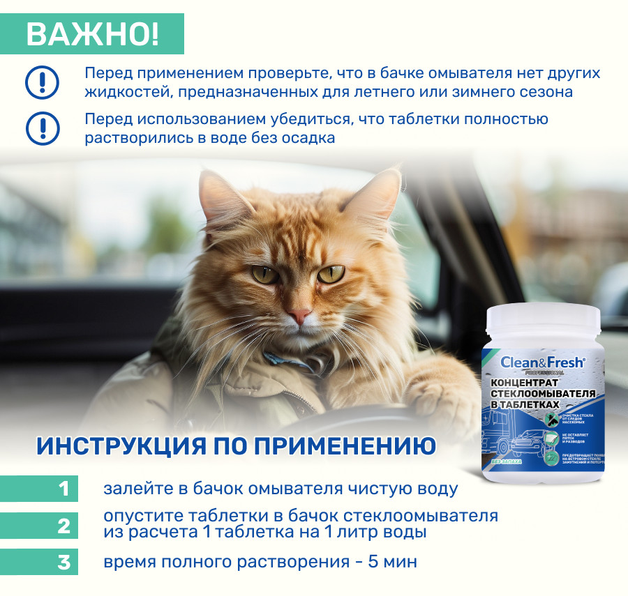 Для приготовления стеклоомывателя необходимо развести 1 таблетку на 1 литр воды, полное растворение концентрата происходит за 5 минут. Полученную жидкость можно залить в бачок омывателя или использовать в бутылке с распылителем для ручной мойки стекол. Концентрат эффективен при использовании при температуре +5°C и выше. Не допускается использование таблеток в готовых летних и зимних стеклоомывателях.
