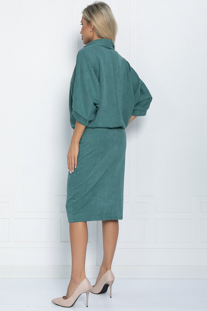 Ткань мягкая, смотрится недешёвой, цвет прекрасный. Пошив аккуратный, фасон скрывает недостатки фигуры немолодой женщины. И бижутерия хороша, хоть и недорогая.