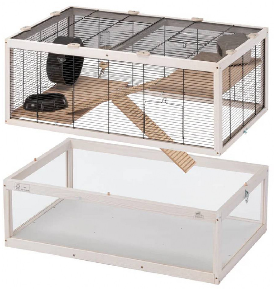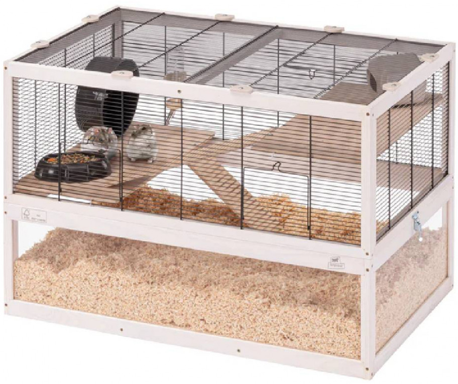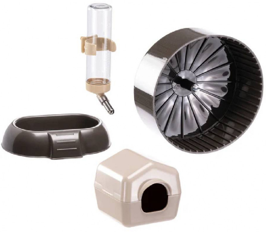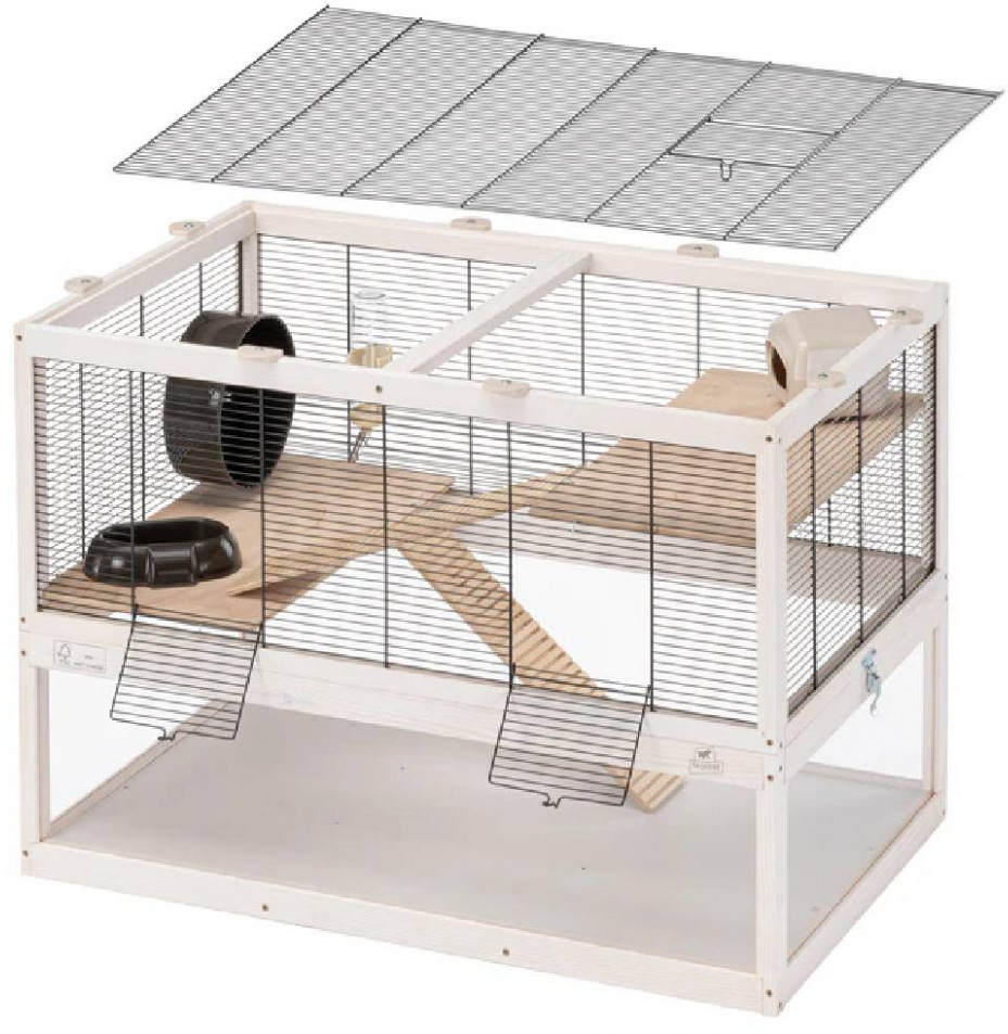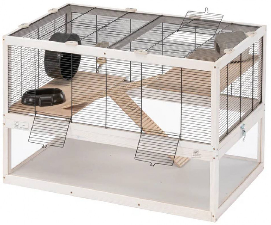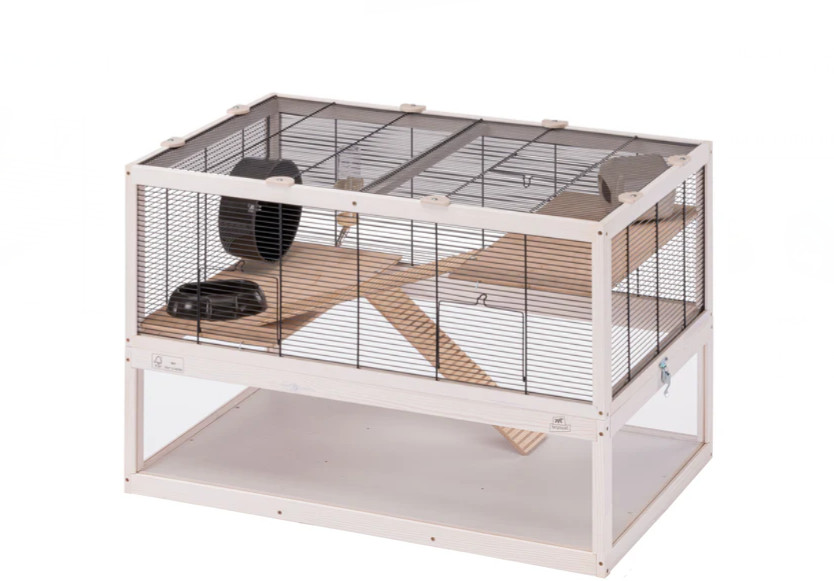В каждой клетке вы найдете такие необходимые аксессуары, как домик для отдыха, колесо для поддержания физической формы, пластиковую кормушку и бутылку для питья с носиком из нержавеющей стали. Прозрачное пластиковое основание каждой клетки позволяет четко видеть вашего питомца, что облегчает наблюдение за его игрой и исследованиями.