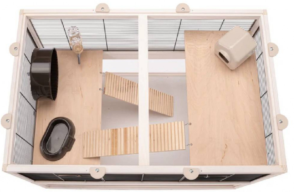 В основе конструкции клетки Domster лежит практичность: открывающаяся крыша обеспечивает легкий доступ и ускоряет уборку. Конструкция позволяет легко отделить верхнюю часть от основания, что упрощает обслуживание и позволяет всегда поддерживать чистоту в месте обитания.