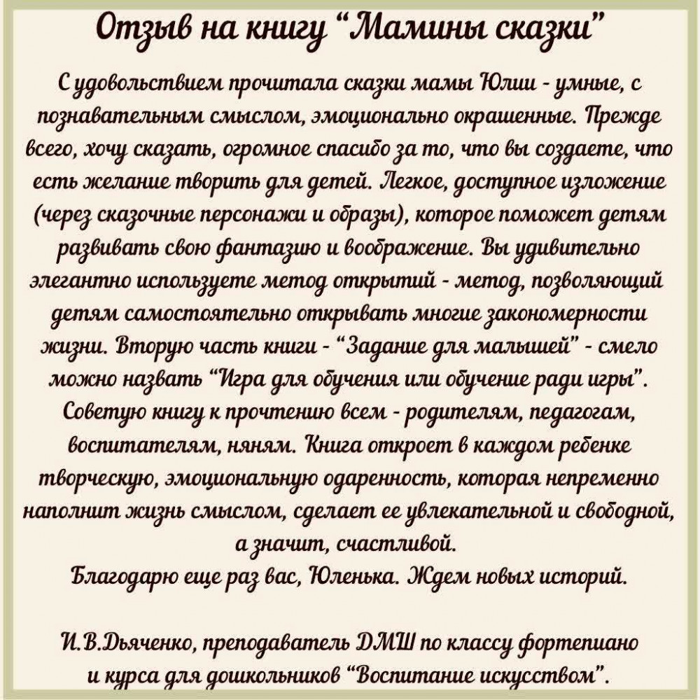 Мамины сказкиВ данный момент этот товар отсутствует в продаже. Возможно, у нас найдется аналогичный или похожий товар здесь. «Мамины сказки» — это детские сказки с красочными иллюстрациями и заданиями для малышей от 3х лет. Автор Суббота Юлия Владимировна, врач реабилитолог, прикладной кинезиолог, магистр медицины постаралась представить детям целую Вселенную — человеческий организм в интересном уникальном стиле сказок. |