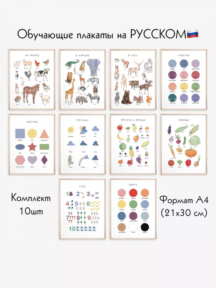 💳 Оплатить за товар можно при получении 🇰🇿 Есть бесплатная доставка по Казахстану от 1 дня 🎁 Копите бонусы с каждой покупки Набор из 10 постеров на русском языке для детей формат А4 с ламинированием.Обучающие постеры для детей, отлично подойдут для раннего развития и помогут познакомить ребенка с животным миром, а так же фруктами и овощами, изучить основные цвета, геометрические фигуры, строение тела, цифры и времена года. |