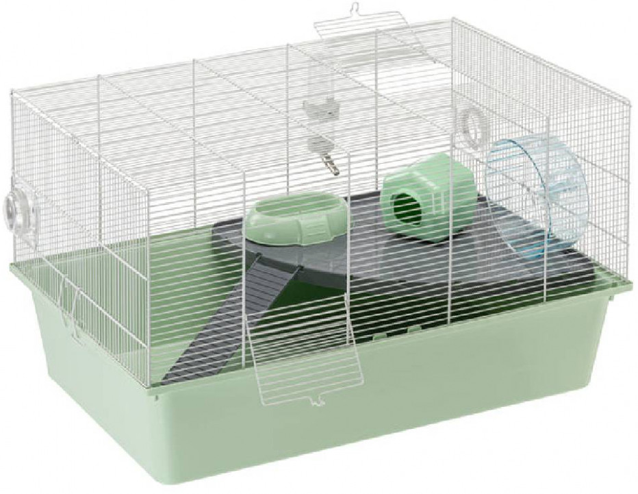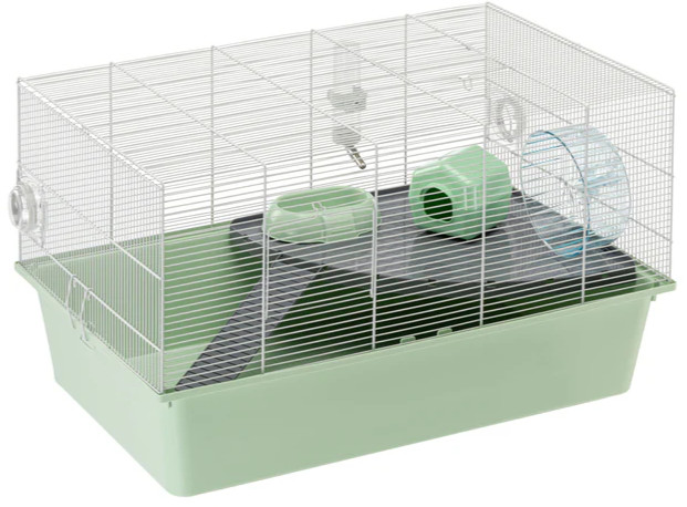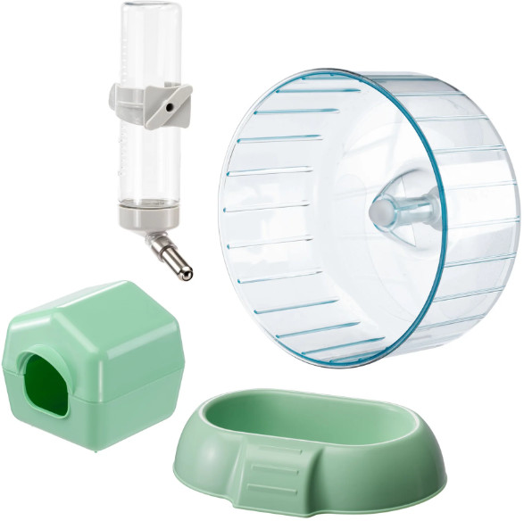 В комплект входят аксессуары: кормушка, бутылка для питья, колесо для бега, домик для отдыха, полка, лестница.