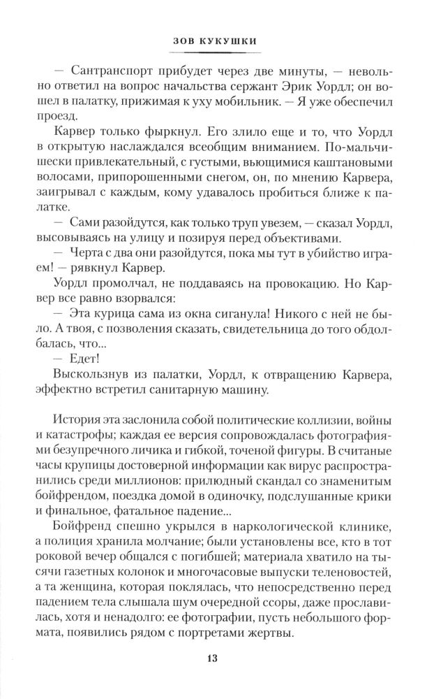 Книга подкупает своим отличным оформлением и тем, что написана Джоан Роулинг. Конечно же, мне, как и многим другим, было интересно прочитать первый детектив известной писательницы. Содержание книги оцениваю как среднее, мне лично не очень понравилось. Но всё же советую к прочтению. Спасибо большое Flip kz за быструю доставку этой книги))) Сегодня уже и 2 заказ доставили. Вы - молодцы! Отлично работаете! Успехов!