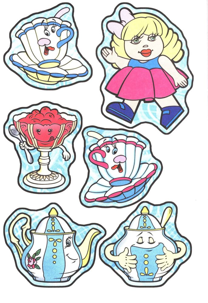 Книжка очень тонкая, всего два листа — обложка и лист для вырезания. Лист лучше не отрывать, а аккуратно разогнуть скрепки. Зато внутренний фон обложки цветной, разрисованный — голубой стол с ажурной скатертью. Если наклеить на картонку, получится небольшая картина. Персонажи: посуда с добрыми личиками (напоминает героев мультфильма «Красавица и чудовище»). Форма фигур сложная, поэтому каждый персонаж подкрашен вокруг фоновой картинкой и обведен дополнительным простым контуром. Нужно вырезать, срезая толстую рамку с контура. Определённого места для наклеивания не предусмотрено, можно размещать персонажей произвольно.