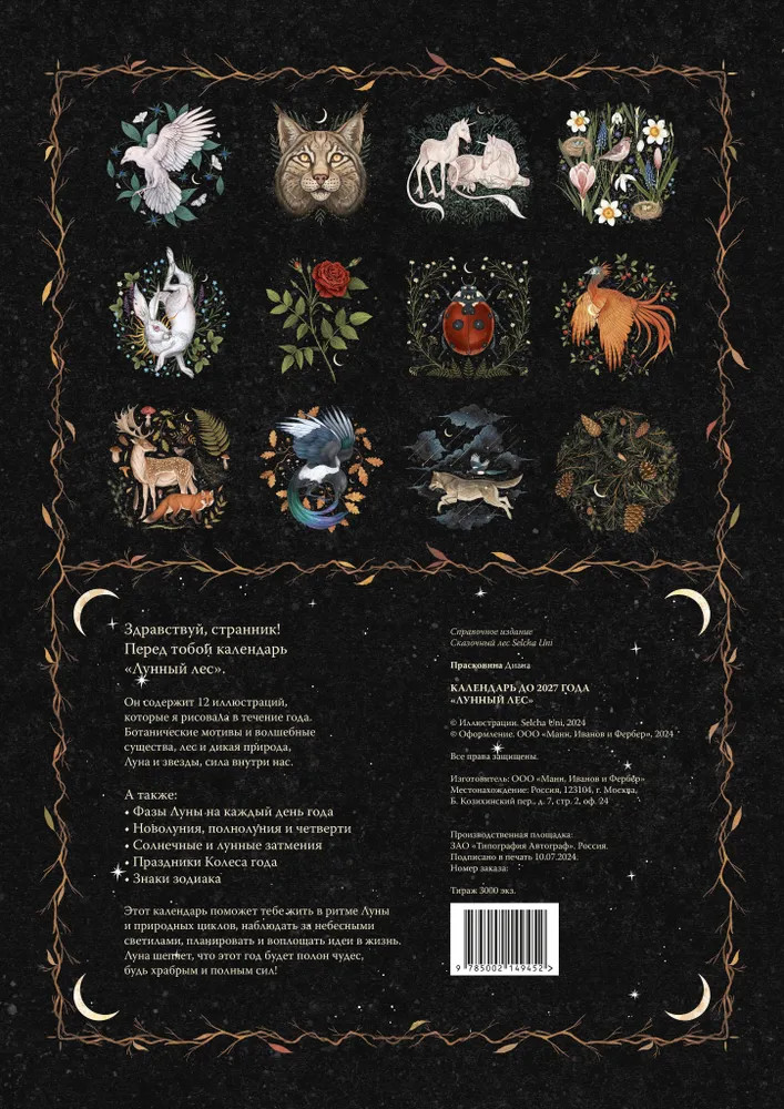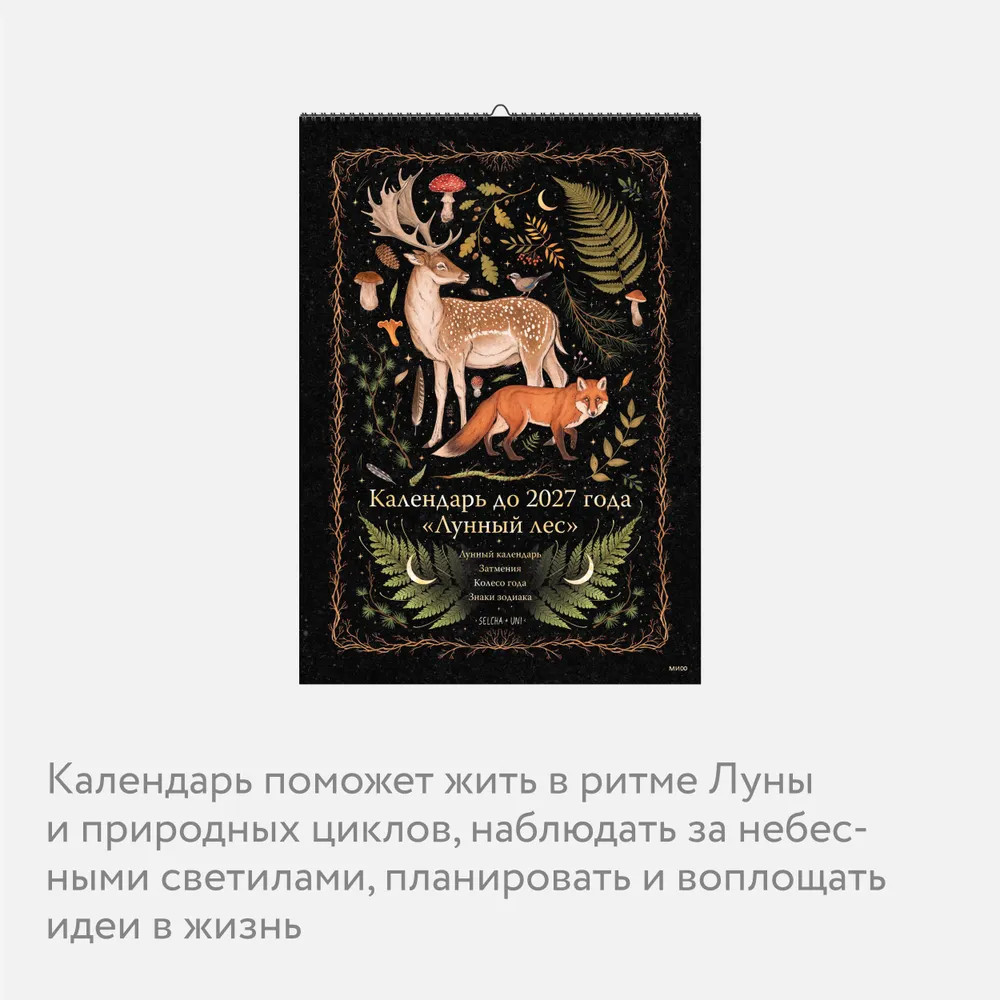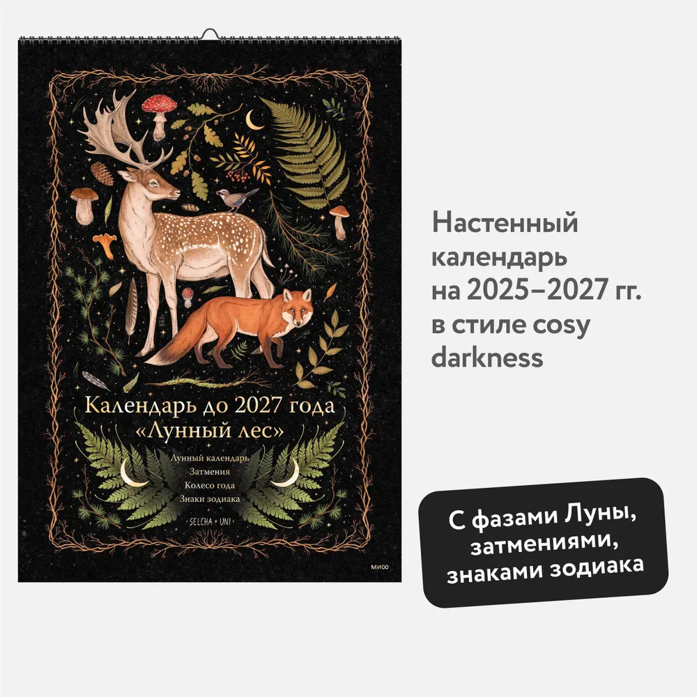 Календарь настенный до 2027 года «Лунный лес»В данный момент этот товар отсутствует в продаже. Возможно, у нас найдется аналогичный или похожий товар здесь. Настенный календарь на 2025–2027 годы в стиле cosy darkness — от популярного иллюстратора Selcha Uni. С фазами Луны, праздниками Колеса года и сказочным лесом на обложке. |