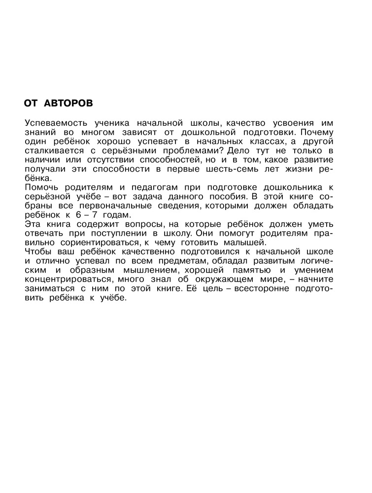 3000 вопросов при поступлении детей в школуВ данный момент этот товар отсутствует в продаже. Возможно, у нас найдется аналогичный или похожий товар здесь. Серия: 3000 примеров Очень часто на собеседовании при поступлении в школу даже развитые, активные дети теряются и не знают, как ответить на поставленные вопросы. Не потому, что не имеют представления о предмете, а потому что, в задании требуется обобщить полученные знания, проанализировать, выстроить логическую цепочку. В этой книге заданы основные темы тестов, предложены типовые задания, сформулированы наиболее часто встречающиеся на собеседовании вопросы. Родители, имея под рукой данное пособие, смогут строить занятия со своим малышом в правильном направлении. |