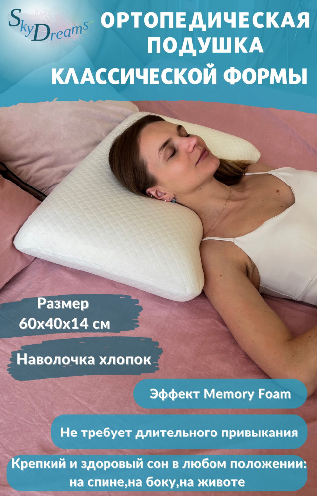Максимальная высота подушки — максимальная поддержка шеи. Это классическая прямоугольная модель подушки, которая не требует длительного привыкания. Удобна и привычна в использовании. Подушка SkyDreams из вязкоэластичной пены значительно улучшает качество сна и жизни. Если Вы испытываете трудности с засыпанием, усталость, головные боли и проблемы со спиной — Вам необходимо подумать о замене подушки. Особенность ортопедической подушки заключается в улучшенной поддержке головы и шеи в правильном положении во время сна. Она имеет более плотную структуру по сравнению с обычными пуховыми или перьевыми подушками. В обычной подушке наполнитель быстро выходит из строя, сминается, сваливается в комки. Чтобы она была удобной, ее нужно постоянно встряхивать. Если подушка подобрана неправильно, это может привести к нарушениям кровоснабжения, онемению конечностей и более серьезным последствиям.