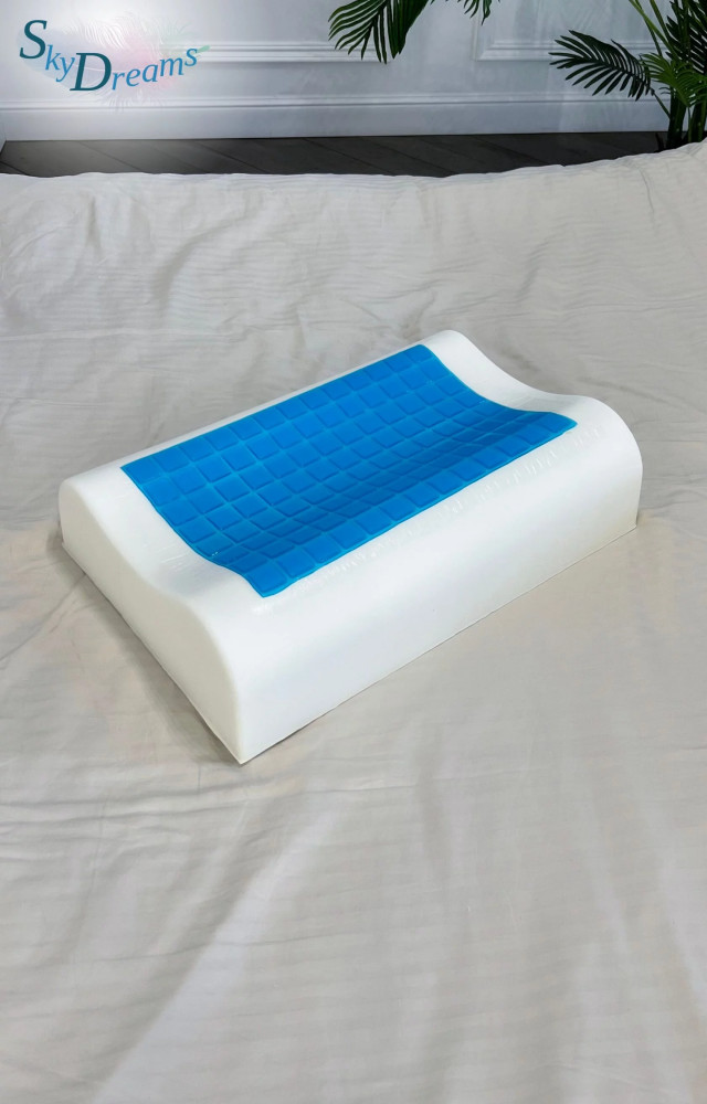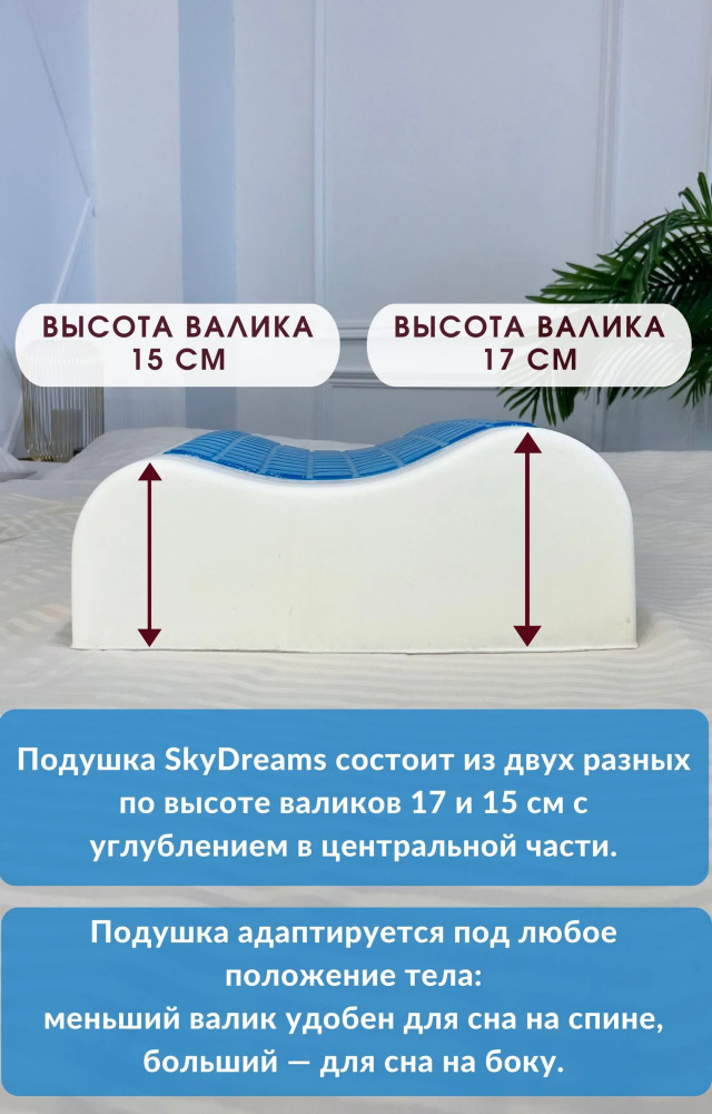 Когда ложишься на гелевую подушку, через 20-30 секунд возникает ощущение прохлады. Постепенно оно достигает максимума и стабилизируется. Поверхность гелевой вставки приятная и прохладная на ощупь. Охлаждающая подушка способствует быстрому восстановлению сил — глубокая фаза сна становится длительной, период между бодрствованием и засыпанием сокращается, сон становится крепким и здоровым. Человек меньше потеет, реже просыпается среди ночи. Гель плавно обволакивает голову и шею, освежает и поддерживает их форму. Он успокаивает, расслабляет и ускоряет засыпание. Размер подушки: 60 × 40 × 17/15 см.