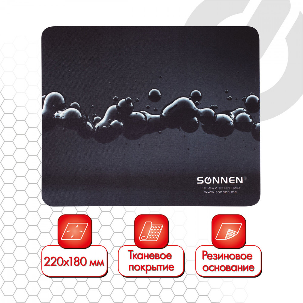 Коврик для мыши Sonnen «Drops» предназначен для обеспечения плавного скольжения и четкого позиционирования курсора компьютерной мыши. Коврик с прорезиненным основанием отлично подойдет для любой поверхности. Отличается интересным визуальным оформлением и подходит для использования с домашним или офисным ПК. Станет лучшим выбором для офиса или домашнего кабинета. Гладкое тканевое покрытие поверхности обеспечивает моментальное движение мыши по коврику и, как следствие, точное перемещение курсора по экрану. Прорезиненное основание надежно фиксирует аксессуар на столе. Благодаря компактным размерам этот привлекательный в плане дизайна коврик для мыши удобно переносить в компьютерной сумке.