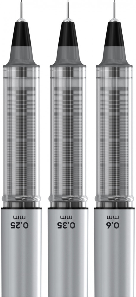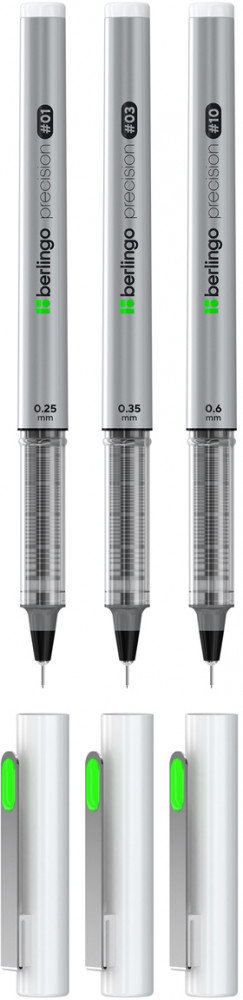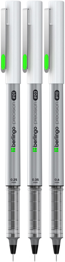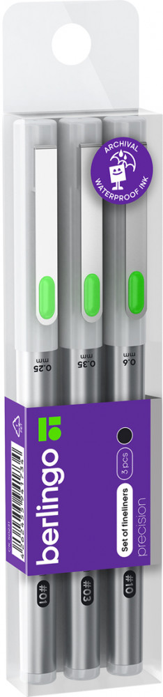 Серия: Precision Пигментные линеры Berlingo Precision — универсальный инструмент для чертёжных и творческих работ с водостойкими чернилами на пигментной основе. В наборе три капиллярные ручки с диаметром пишущего узла 0,3/0,34/0,65 мм и толщиной линии 0,25/0,35/0,6 мм соответственно. Линеры упакованы в пластиковый пенал с европодвесом. Благодаря содержанию твёрдых, но очень мелких частиц пигмента, краска остаётся на поверхности материала, а не впитывается внутрь. В результате рисунок или надпись, сделанные такими чернилами, надолго сохраняет первоначальную яркость и насыщенность, не выцветает на солнце.