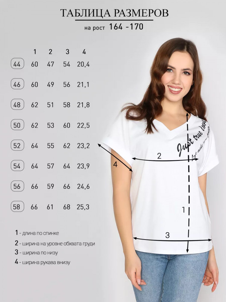 Наш бренд Fashion Margo - это идеальный выбор для любой дамы, которая хочет выглядеть стильно и привлекательно в любое время года. Футболка изготовлена из мягкой плотной натуральной хлопковой ткани, которая обеспечивает комфорт и свободу движений. Материал дышащий, приятный к коже, прочный, хорошо сохраняет форму, не садится после стирки (при соблюдении рекомендаций по уходу). Кроме того, материал не выгорает на солнце, это отличный выбор для тренировок летом, а также солнечной теплой весной или осенью. Фактура тонкой ткани трикотажная, гладкая и нежная. Страна производства Россия. Вещь универсальная, подходит для весенних, осенних и летних месяцев. Покрой удлиненный, не слишком короткий, свободный, на худых будет смотреться как легкий оверсайз. Просторный крой не стесняет движения. Она подойдет даже будущим мамам, девушкам с пышными форами и кормящим женщинам. Вырез горловин классический. В нашем магазине вы найдете эту модель в размерах от 44 до 68. Широкий размерный ряд позволяет выбрать подходящую модель женщине любого телосложения. Крутая однотонная туника с рисунком будет классно смотреться как на высокой, так и на невысокой девушке. Модная футболка идеально подходит для девочек - подростков, взрослых девочек и даже бабушек, которые хотят выглядеть красиво в школе, на офисной работе или во время прогулок на улице. Футболочка нарядная также хороша для спортивных занятий, таких как: фитнес, йога, танцы, бег, тренировки в спортзале, школьные уроки физкультуры и многое другое. Это прекрасная вещь для повседневной носки, а также для особых случаев, таких как фотосессии. Изделие можно носить дома, на даче или пляже. Милая модная стильная современная из хлопка - это классика женской моды, которая должна быть в гардеробе каждой. Трендовая туничка поможет создать прикольный образ в уличном стиле, подходящий на все случаи жизни.