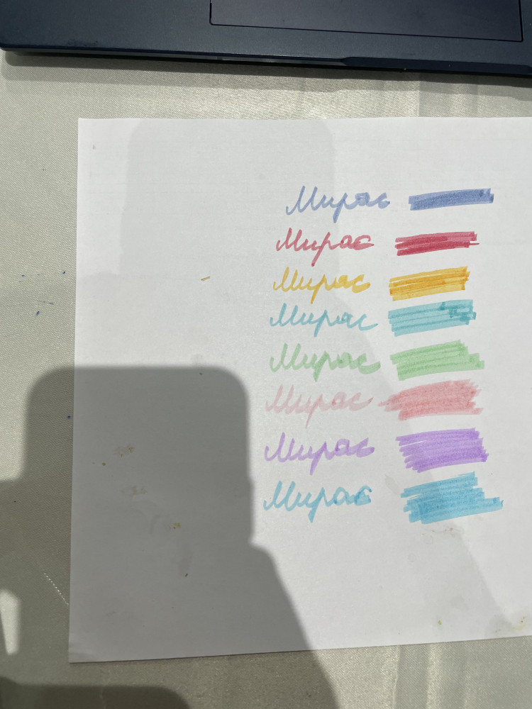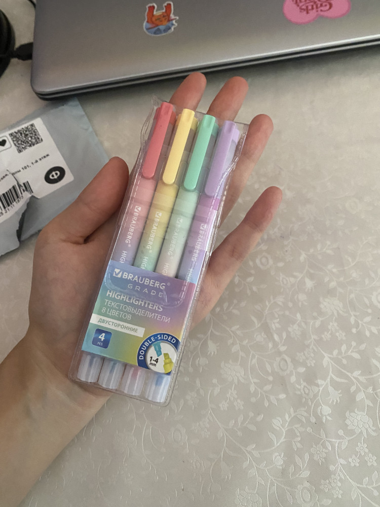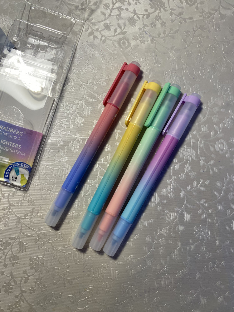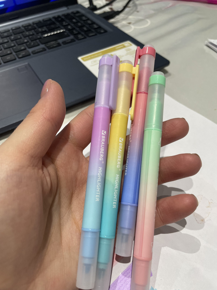 1.Две стороны – это удобно для выделения текста разными стилями. 2.Яркие цвета – оттенки насыщенные, но не слишком агрессивные для глаз, не размазывают чернила. 3.Не протекают – даже на тонкой бумаге следы на обратной стороне практически не видны. 4.Удобный корпус – маркеры хорошо лежат в руке, крышки плотно закрываются.