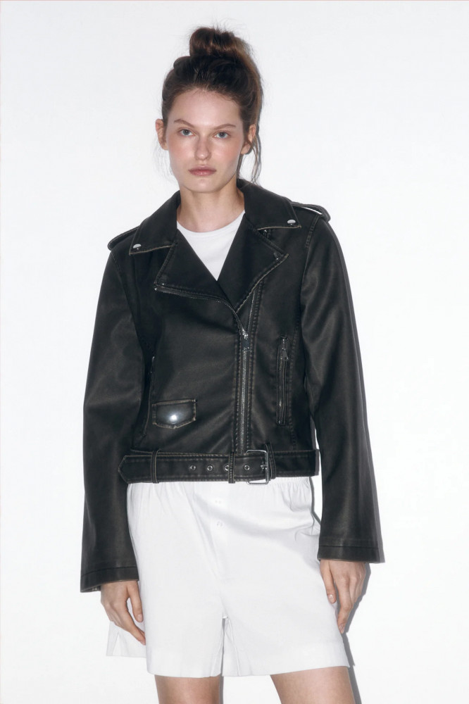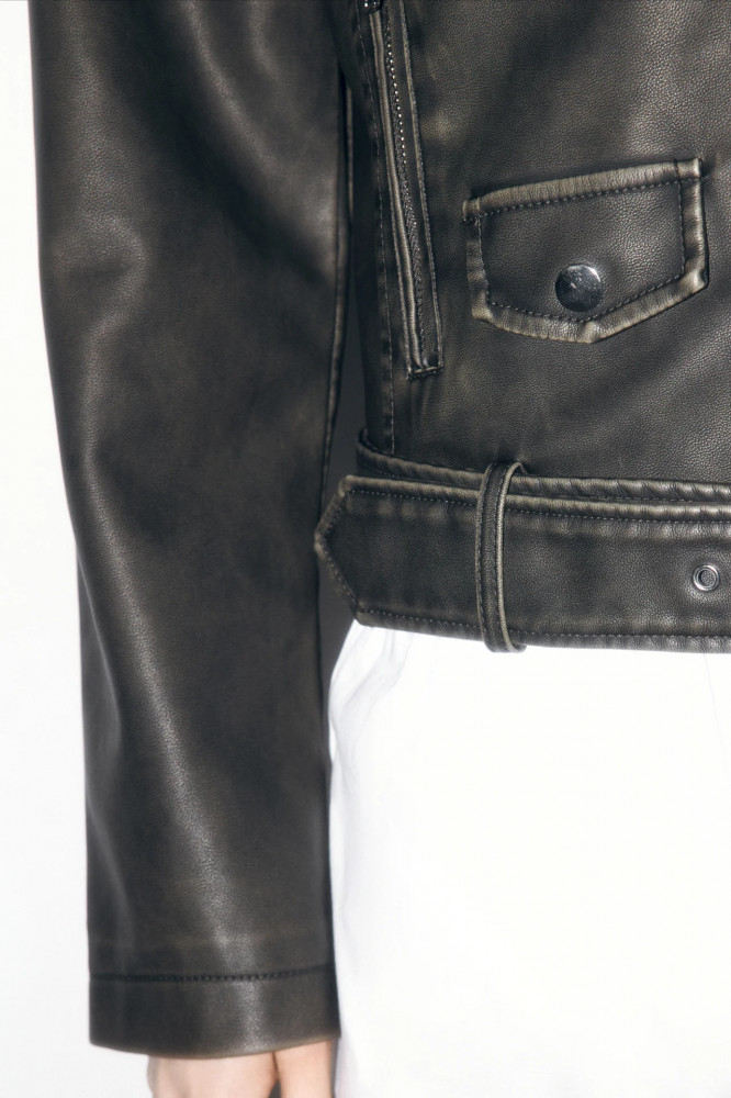 Косуха цвета хаки с кожаной фактурой и трендовым вареным эффектом для стильных аутфитов в байкерском стиле или для повседневных луков. Стильная и универсальная куртка-косуха, которая защитит тебя от ветра и дождя и подойдет как на прохладное лето, так и на раннюю осень / позднюю весну. Создавай образы в стиле гранж или панк-рок. Добавь к образам денимный рваный низ или создай тотал-лук из кожи. Закончи образ массивной обувью и стильными очками-авиаторами. Сочетай косуху с разными фактурами от шифона до кружева, чтобы подчеркнуть одновременно женственность и дерзость твоего характера.