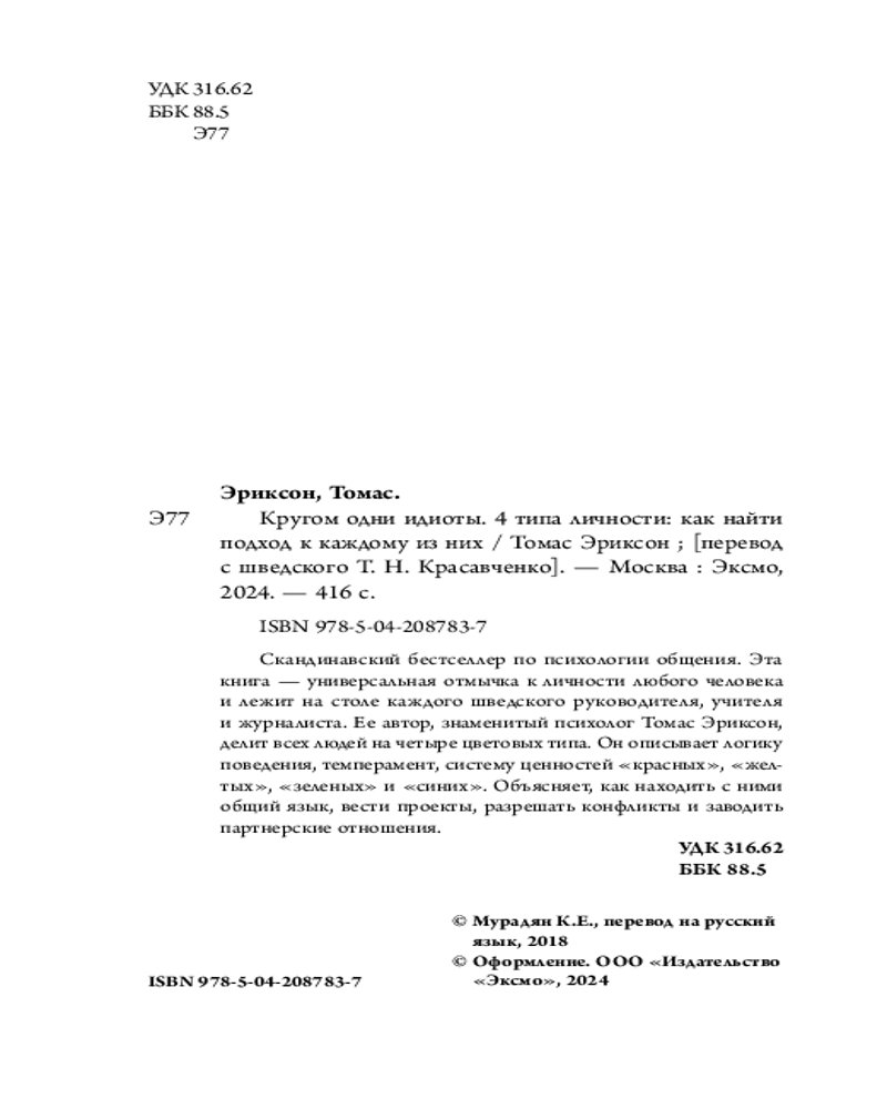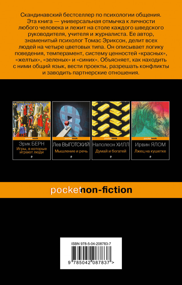 💳 Оплатить за товар можно при получении 🇰🇿 Есть бесплатная доставка по Казахстану от 1 дня 🎁 Копите бонусы с каждой покупки Серия: Pocket book (обложка). Non-fiction Скандинавский бестселлер по психологии общения. Эта книга — универсальная отмычка к личности любого человека и лежит на столе каждого шведского руководителя, учителя и журналиста. Ее автор, знаменитый психолог Томас Эриксон, делит всех людей на четыре цветовых типа. Он описывает логику поведения, темперамент, систему ценностей «красных», «желтых», «зеленых» и «синих». Объясняет, как находить с ними общий язык, вести проекты, разрешать конфликты и заводить партнерские отношения. |