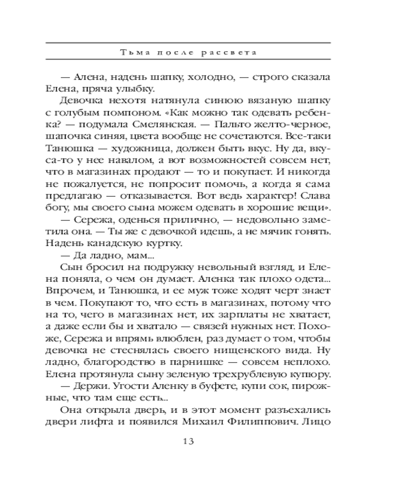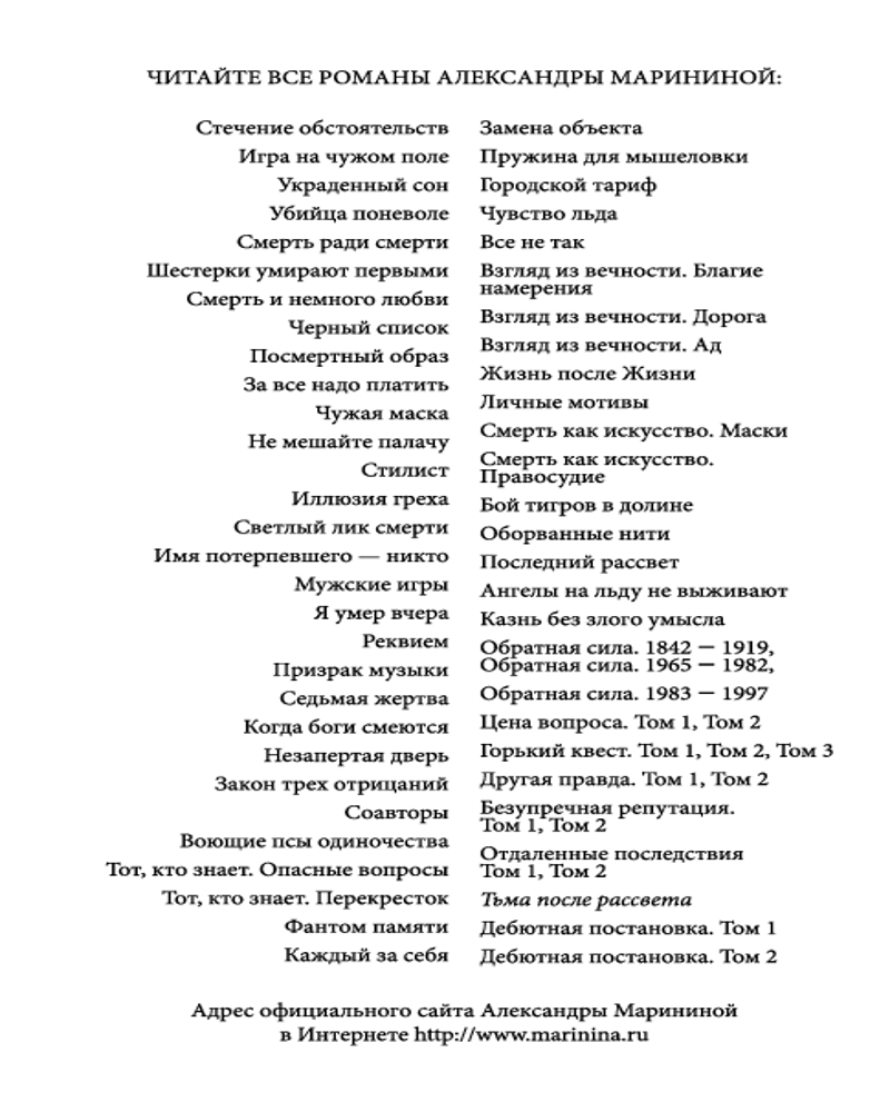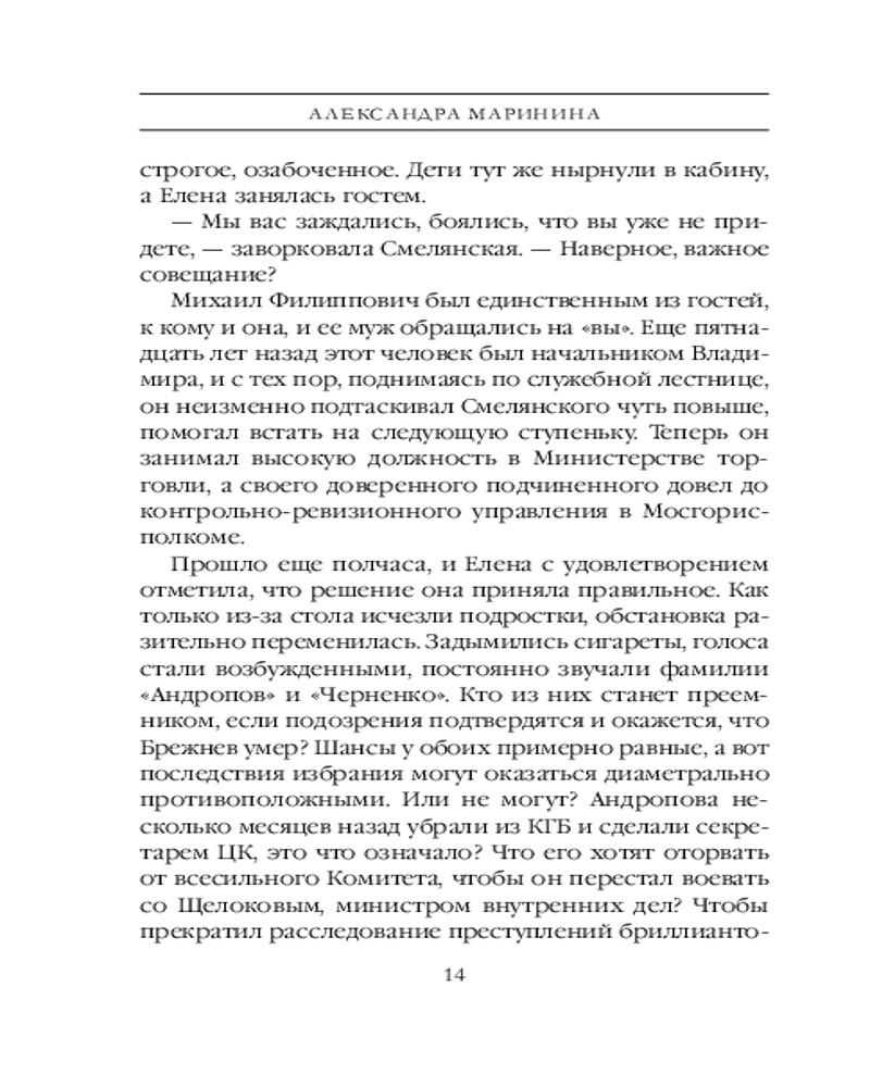 Серия: А.Маринина. Больше чем детектив. Новое оформление Ноябрь 1982 года. Годовщина свадьбы супругов Смелянских омрачена смертью Леонида Брежнева. Новый генсек — большой стресс для людей, которым есть что терять. А Смелянские и их гости как раз из таких — настоящая номенклатурная элита. Но это еще не самое страшное. Вечером их тринадцатилетний сын Сережа и дочь подруги Алена ушли в кинотеатр и не вернулись... После звонка «с самого верха», к поискам пропавших детей подключают майора милиции Виктора Гордеева. От быстрого и, главное, положительного результата зависит его перевод на должность замначальника «убойного» отдела. Но какие тут могут быть гарантии? А если они уже мертвы? Тем более в стране орудует маньяк, убивающий подростков 13-16 лет. И друг Гордеева — сотрудник уголовного розыска Леонид Череменин — предполагает худшее. Впрочем, у его приемной дочери — недавней выпускницы юрфака МГУ Насти Каменской — иное мнение: пропавшие дети не вписываются в почерк серийного убийцы. Опера начинают отрабатывать все возможные версии. А потом к расследованию подключаются сотрудники КГБ... |