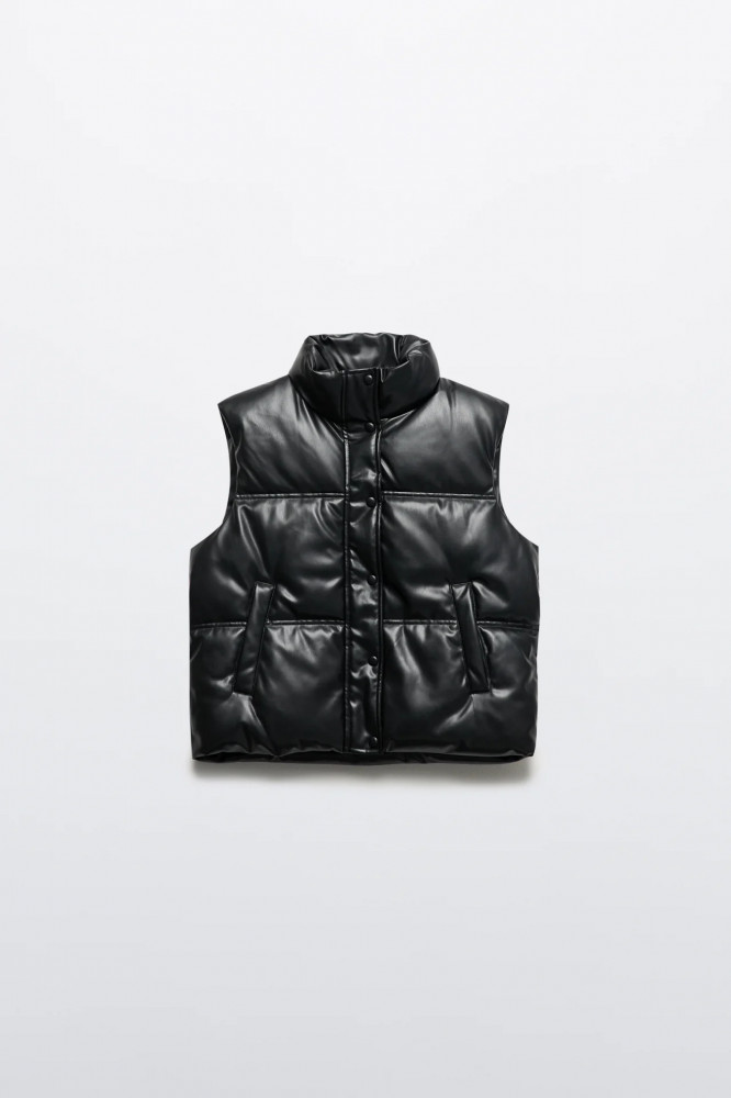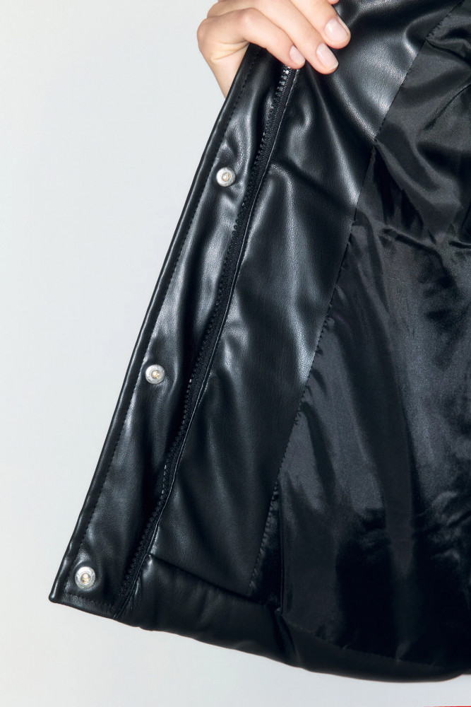 Короткий женский стеганый жилет прямого кроя из гладкой искусственной кожи с легким искусственным утеплителем (синтепон). Высокий воротник-стойка для защиты от холода и ветра. Два боковых прорезных кармана без застежки. Застежка на молнию и планку с кнопками. Присборенный нижний для защиты от поддувания. Однотонные расцветки для любого образа и настроения.