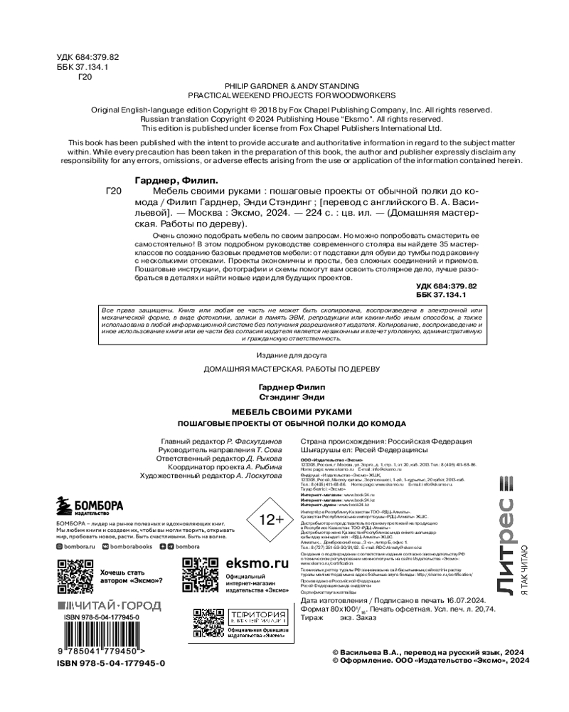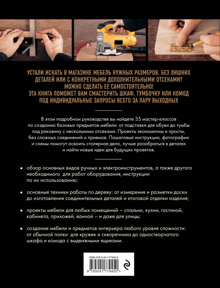💳 Оплатить за товар можно при получении 🇰🇿 Есть бесплатная доставка по Казахстану от 1 дня 🎁 Копите бонусы с каждой покупки Серия: Домашняя мастерская. Работы по дереву Очень сложно подобрать мебель по своим запросам. Но можно попробовать смастерить ее самостоятельно! В этом подробном руководстве современного столяра вы найдете 35 мастер-классов по созданию базовых предметов мебели: от подставки для обуви до тумбы под раковину с несколькими отсеками. Проекты экономичны и просты, без сложных соединений и приемов. Пошаговые инструкции, фотографии и схемы помогут вам освоить столярное дело, лучше разобраться в деталях и найти новые идеи для будущих проектов. |