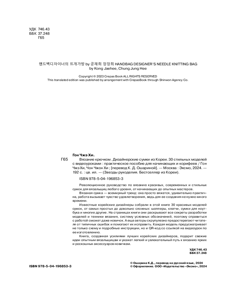 💳 Оплатить за товар можно при получении 🇰🇿 Есть бесплатная доставка по Казахстану от 1 дня 🎁 Копите бонусы с каждой покупки Серия: Звезды рукоделия. Бестселлер из Кореи Революционное руководство по вязанию красивых, современных и стильных сумок для вязальщиц любого уровня, от начинающих до опытных мастеров. Вязаная сумка — всемирный тренд: она просто вяжется, удивительно практична, работа вызывает чувство удовлетворения, ведь для ее создания не нужно много времени. Известные корейские дизайнеры собрали в этой книге 30 красивых моделей сумок, от самых простых до довольно сложных: шопперы, клатчи, сумки для ноутбука и многие другие. На страницах книги они раскрывают все секреты разработки моделей и техники вязания, систему условных обозначений, поэтому справиться с работой сможет даже новичок. А еще авторы скрупулезно предостерегают читателя от типичных ошибок и помогают их исправить. Каждая модель предусматривает не только схему и подробные инструкции, но и QR-код со ссылкой на видеоурок по ее изготовлению. Книга, созданная усилиями лучших корейских дизайнеров, подарит свежие идеи опытным вязальщицам и укажет легкий и увлекательный путь к вязанию ярких и роскошных аксессуаров новичкам. |