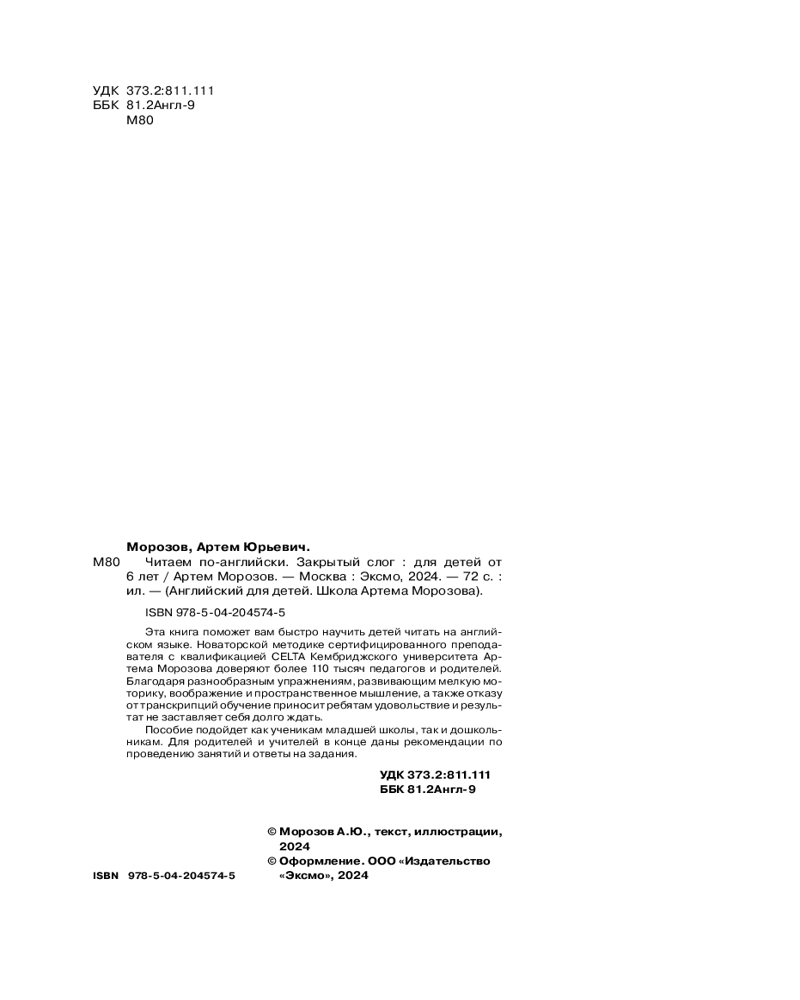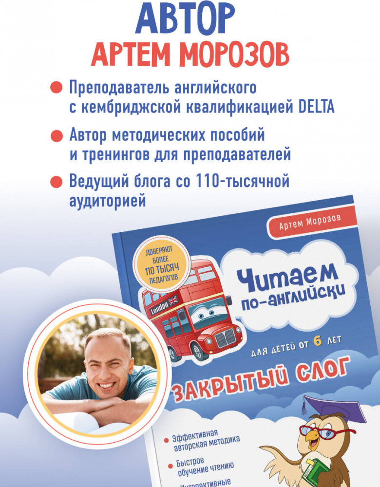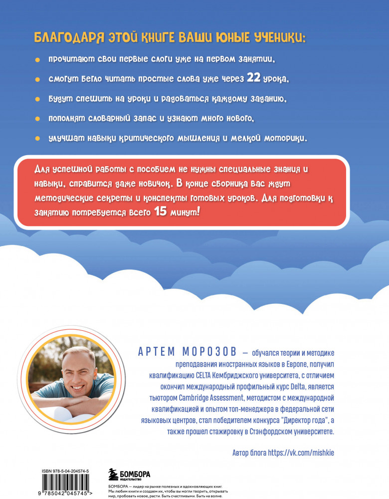 💳 Оплатить за товар можно при получении 🇰🇿 Есть бесплатная доставка по Казахстану от 1 дня 🎁 Копите бонусы с каждой покупки Серия: Английский для детей. Школа Артема Морозова Эта книга поможет вам быстро научить детей читать на английском языке. Новаторской методике сертифицированного преподавателя с квалификацией CELTA Кембриджского Университета Артема Морозова доверяют более 110 тысяч педагогов и родителей. Благодаря разнообразным упражнениям, развивающим мелкую моторику, воображение и пространственное мышление, а также отказу от транскрипции обучение приносит ребятам удовольствие, и результат не заставляет себя долго ждать. Пособие подойдет как ученикам младшей школы, так и дошкольникам. Для родителей и учителей в конце даны рекомендации по проведению занятий и ответы на задания. |