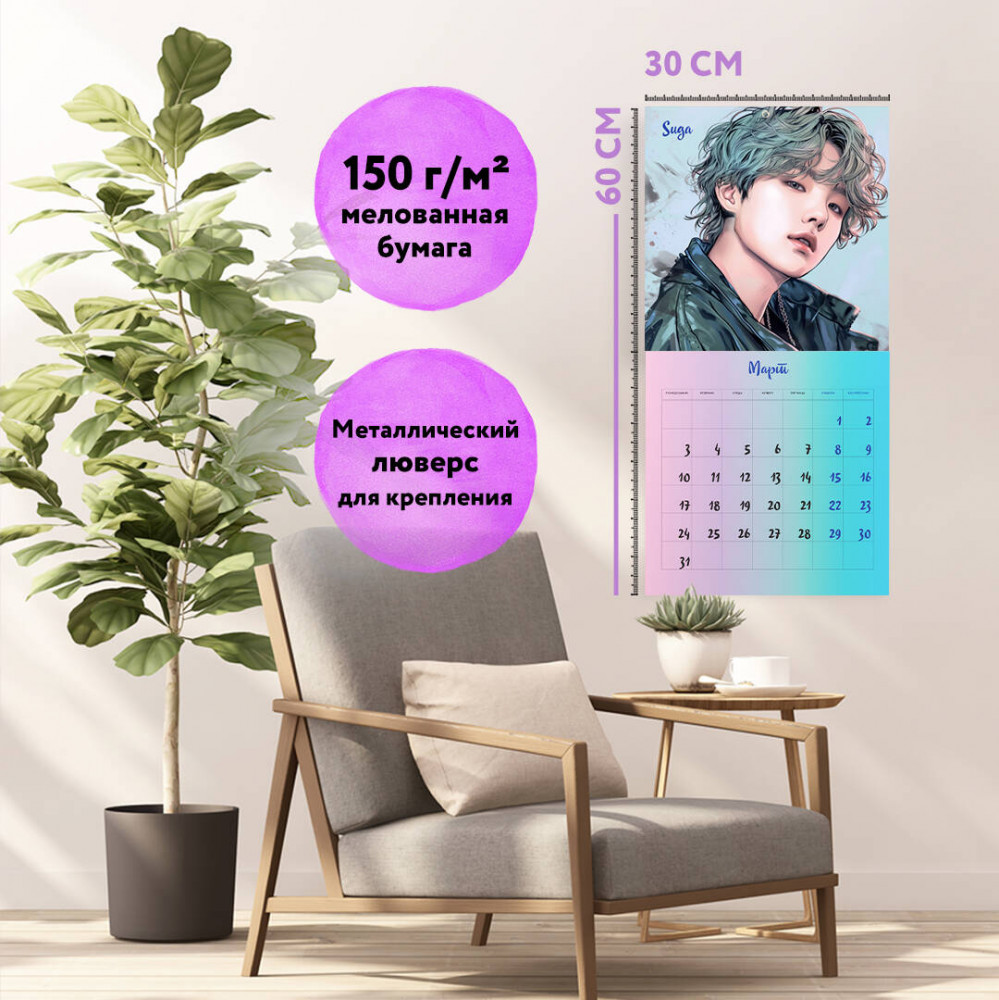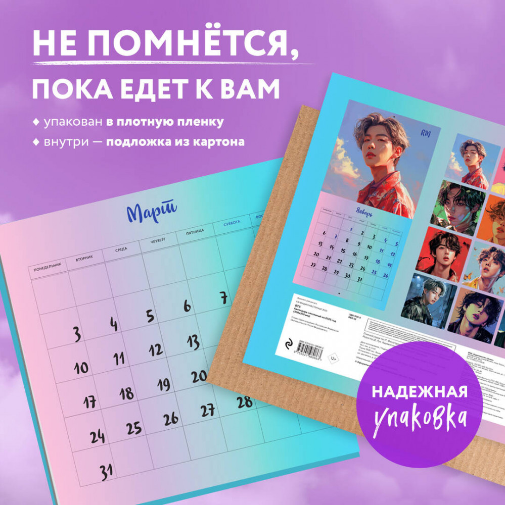 Календарь для ARMY, которой я являюсь. Доставили в прозрачной глянцевой упаковке. Между листами календаря вложИли лист гофрокартона ( чтобы не нарушить целостность и товарный вид). Листы матовые, с изображением участников группы BTS. Печать чёткая и яркая.