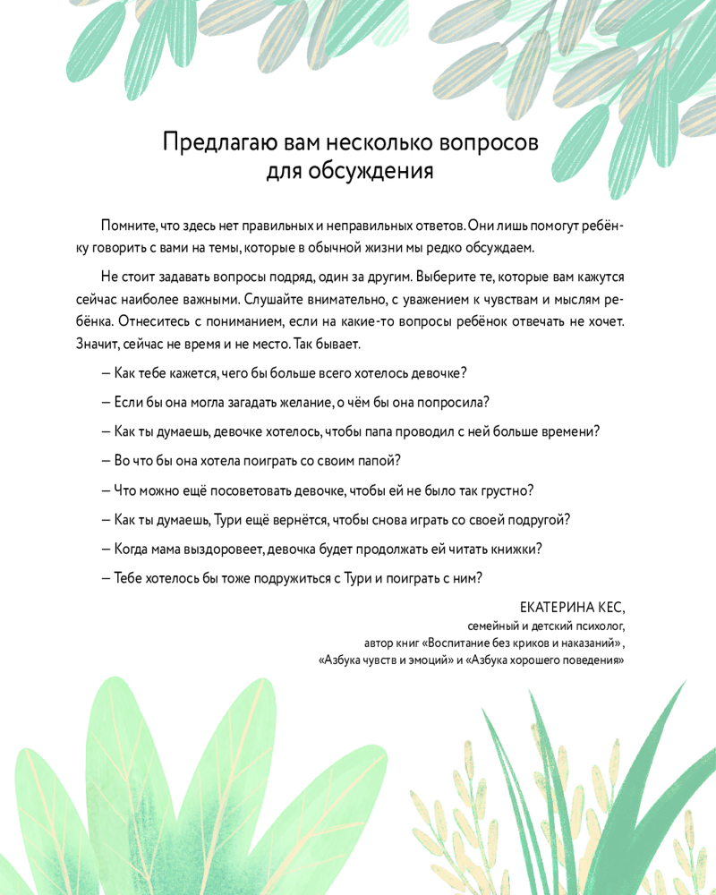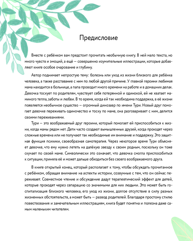 Серия: Сказкотерапия в картинках для детей и их родителей Как быть, если мама болеет и всё, что ты можешь для неё сделать, — читать любимую книгу о динозаврах? Главной героине сказки тяжело в одиночку справляться с переживаниями, но однажды в её жизни появляется Тури — большой говорящий динозавр. С ним весело играть и можно поговорить о самом важном и сокровенном. Но что, если Тури придётся покинуть свою подругу? Совместное чтение терапевтической сказки об исцеляющей силе дружбы поможет родителям научить своих детей справляться с грустными эмоциями. Предисловие и вопросы для обсуждения от детского психолога и автора бестселлеров по воспитанию, подскажут, как вовлеченно слушать, на что обращать внимание и как грамотно направлять ребёнка в его сложных переживаниях. |