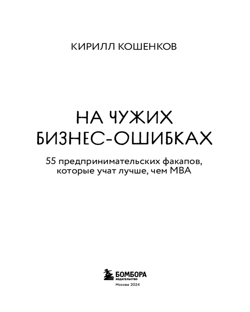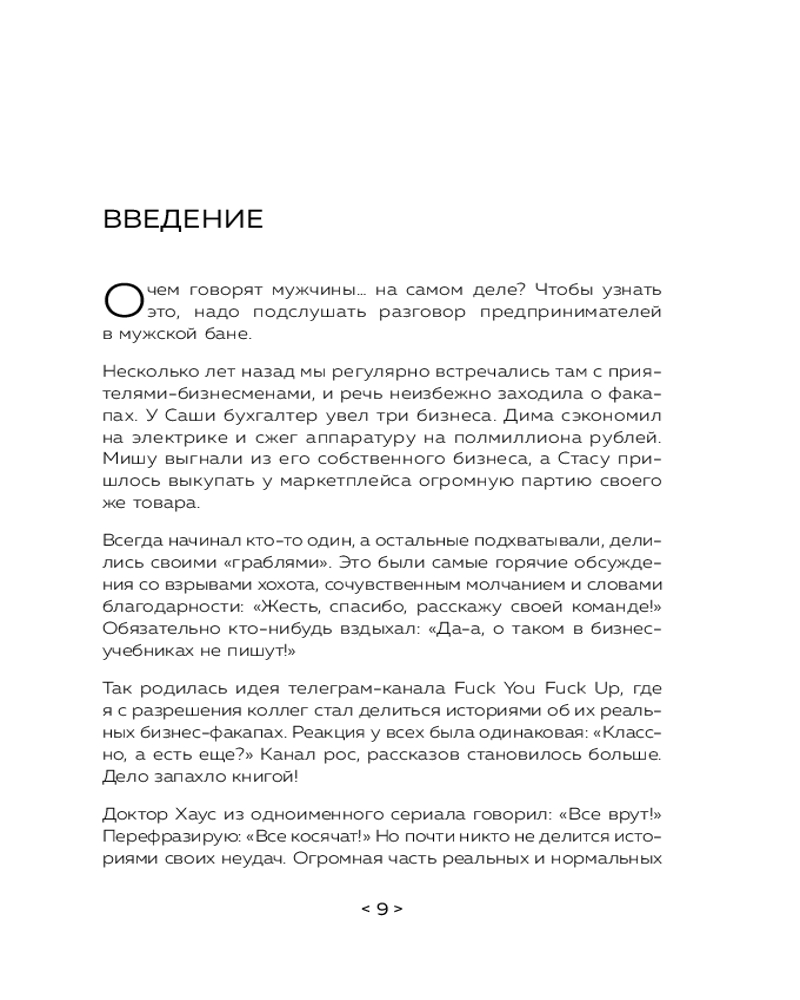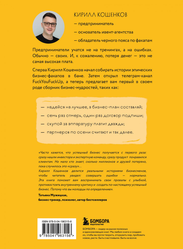 💳 Оплатить за товар можно при получении 🇰🇿 Есть бесплатная доставка по Казахстану от 1 дня 🎁 Копите бонусы с каждой покупки Серия: Зато теперь я умный. Легко и с юмором о сложностях предпринимательства Предприниматели учатся не на тренингах, а на ошибках. Обычно — своих. И, к сожалению, потеря денег — это не самая высокая плата. Сперва Кирилл Кошенков начал собирать истории эпических бизнес-факапов в бане. Затем открыл телеграм-канал FuckYouFuckUp, а теперь предлагает вам первый в своем роде сборник бизнес-мудростей, таких как: — надейся на лучшее, а бизнес-план составляй; — семь раз отмерь, один раз договор подпиши; — скупой за аппаратуру платит дважды; — партнеров по осени считают и так далее. |