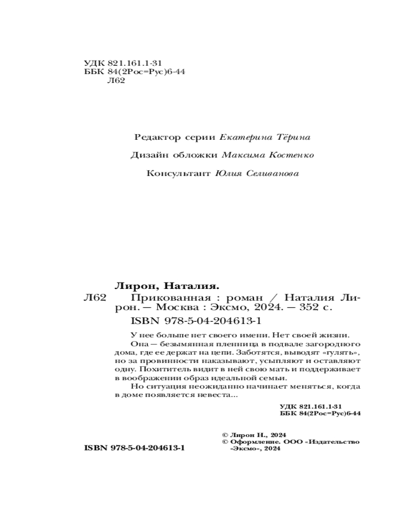 💳 Оплатить за товар можно при получении 🇰🇿 Есть бесплатная доставка по Казахстану от 1 дня 🎁 Копите бонусы с каждой покупки Серия: Выжить любой ценой. Психологический триллер У нее больше нет своего имени. Нет своей жизни. Она — безымянная пленница в подвале загородного дома, где ее держат на цепи. Заботятся, выводят «гулять», но за провинности, наказывают, усыпляют и оставляют одну. Похититель видит в ней свою мать и поддерживает в воображении образ идеальной семьи. Но ситуация неожиданно начинает меняться, когда в доме появляется невеста... |