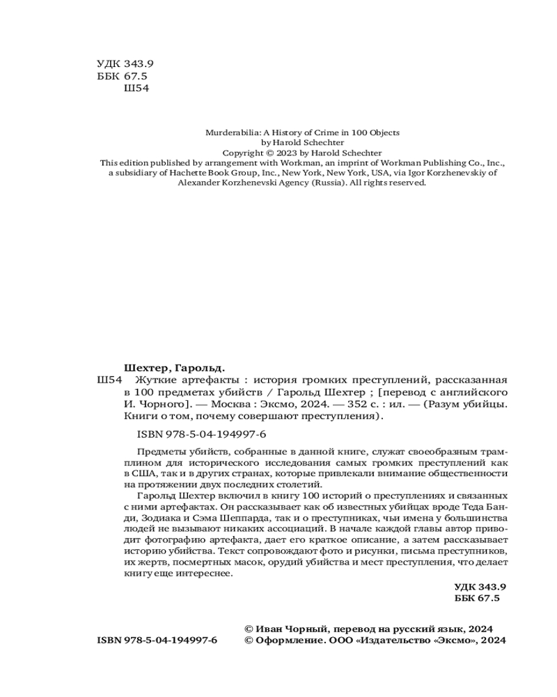 💳 Оплатить за товар можно при получении 🇰🇿 Есть бесплатная доставка по Казахстану 🎁 Копите бонусы с каждой покупки Серия: Разум убийцы. Книги о том, почему совершают преступления Предметы убийств, собранные в данной книге, служат своеобразным трамплином для исторического исследования самых громких преступлений как в США, так и в других странах, которые привлекали внимание общественности на протяжении двух последних столетий. Гарольд Шехтер включил в книгу 100 историй о преступлениях и связанных с ними артефактах. Он рассказывает, как об известных убийцах вроде Теда Банди, Зодиака и Сэма Шеппарда, так и о преступниках, чьи имена у большинства людей не вызывают никаких ассоциаций. В начале каждой главы автор приводит фотографию артефакта, дает его краткое описание, а затем рассказывает историю убийства. Текст сопровождают фото и рисунки, письма преступников, их жертв, посмертных масок, орудий убийства и мест преступления, что делает книгу еще интереснее. |