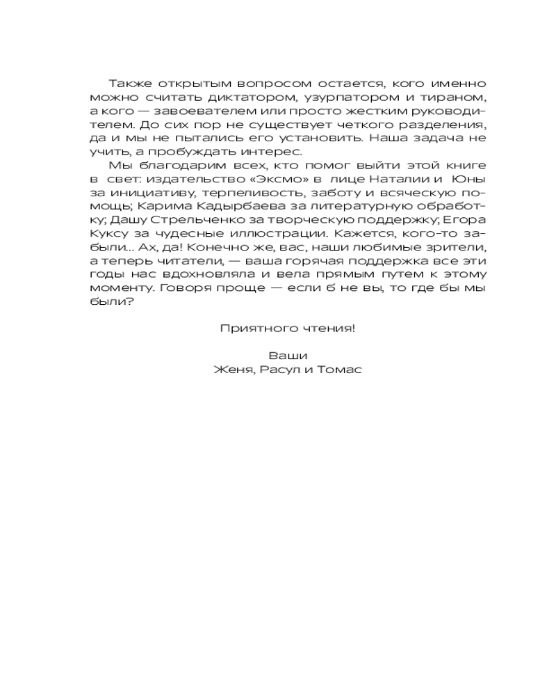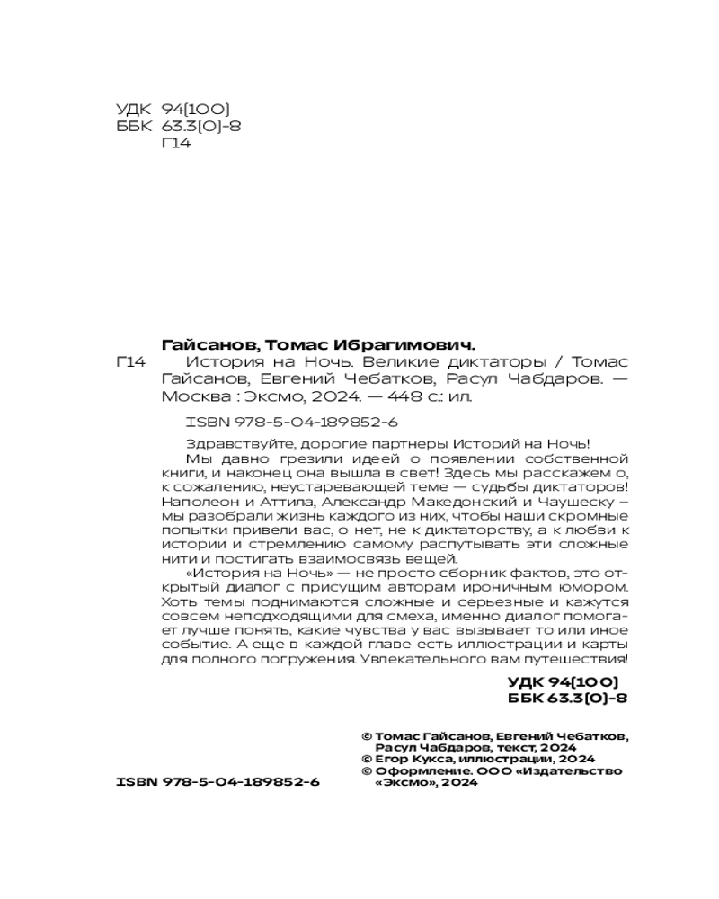 💳 Оплатить за товар можно при получении 🇰🇿 Есть бесплатная доставка по Казахстану от 1 дня 🎁 Копите бонусы с каждой покупки Здравствуйте, дорогие партнеры Историй на Ночь! Мы давно грезили идеей о появлении собственной книги, и, наконец, она вышла в свет! Здесь мы расскажем о, к сожалению, неустаревающей теме — судьбы диктаторов! Наполеон и Аттила, Александр Македонский и Чаушеску — мы разобрали жизнь каждого из них, чтобы наши скромные попытки привели вас, о, нет, не к диктаторству, а к любви к истории и стремлению самому распутывать эти сложные нити и постигать взаимосвязь вещей. «Истории на ночь» — не просто сборник фактов, это открытый диалог с присущим авторам ироничным юмором. Хоть темы поднимаются сложные и серьёзные и кажутся совсем неподходящими для смеха, именно диалог помогает лучше понять, какие чувства у вас вызывает то или иное событие. А еще в каждой главе есть иллюстрации и карты для полного погружения. Увлекательного вам путешествия! |
