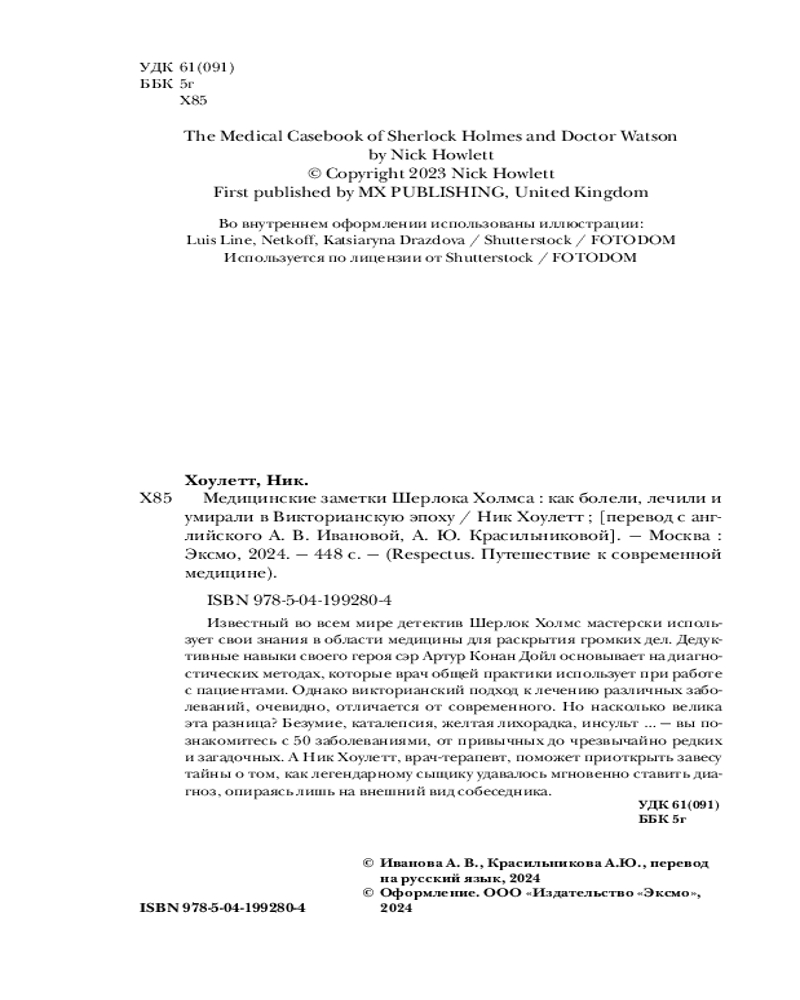 💳 Оплатить за товар можно при получении 🇰🇿 Есть бесплатная доставка по Казахстану от 1 дня 🎁 Копите бонусы с каждой покупки Серия: Respectus. Путешествие к современной медицине Известный во всем мире детектив Шерлок Холмс мастерски использует свои знания в области медицины для раскрытия громких дел. Дедуктивные навыки своего героя Сэр Артур Конан Дойл основывает на диагностических методах, которые врач общей практики использует при работе с пациентами. Однако викторианский подход к лечению различных заболеваний, очевидно, отличается от современного. Но насколько велика эта разница? Безумие, каталепсия, желтая лихорадка, инсульт ... — вы познакомитесь с 52 заболеваниями, от привычных до чрезвычайно редких и загадочных. А Ник Хоулетт, врач-терапевт, поможет приоткрыть завесу тайны о том, как легендарному сыщику удавалось мгновенно ставить диагноз, опираясь лишь на внешний вид собеседника. |