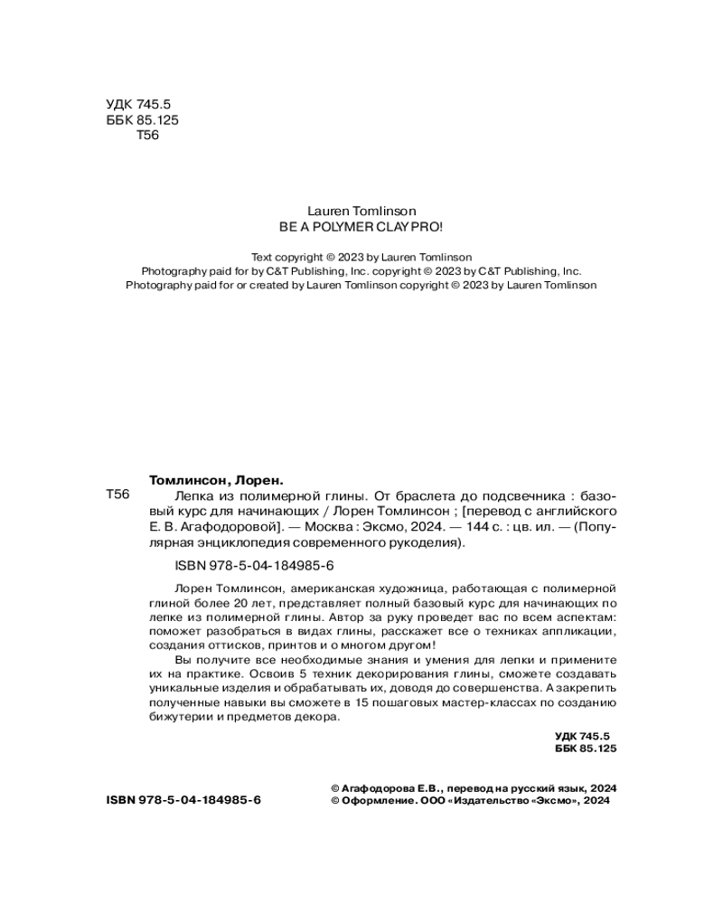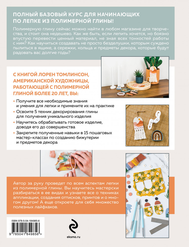 💳 Оплатить за товар можно при получении 🇰🇿 Есть бесплатная доставка по Казахстану от 1 дня 🎁 Копите бонусы с каждой покупки Серия: Популярная энциклопедия современного рукоделия Лорен Томлинсон, американская художница, работающая с полимерной глиной более 20 лет, представляет полный базовый курс для начинающих по лепке из полимерной глины. Автор за руку проведет вас по всем аспектам: поможет разобраться в видах глины, расскажет все о техниках аппликации, создания оттисков, принтов и о многом другом! Вы получите все необходимые знания и умения для лепки и примените их на практике. Освоив 5 техник декорирования глины, сможете создавать уникальные изделия и обрабатывать их, доводя до совершенства. А закрепить полученные навыки вы сможете в 15 пошаговых мастер-классах по созданию бижутерии и предметов декора. |