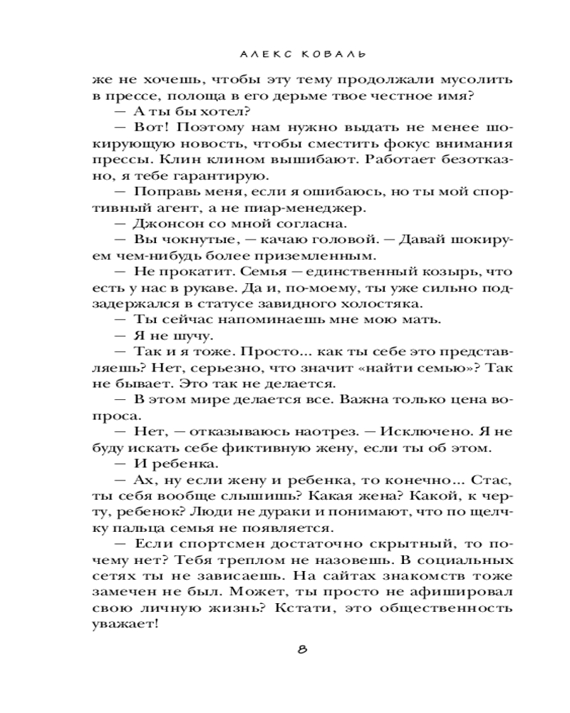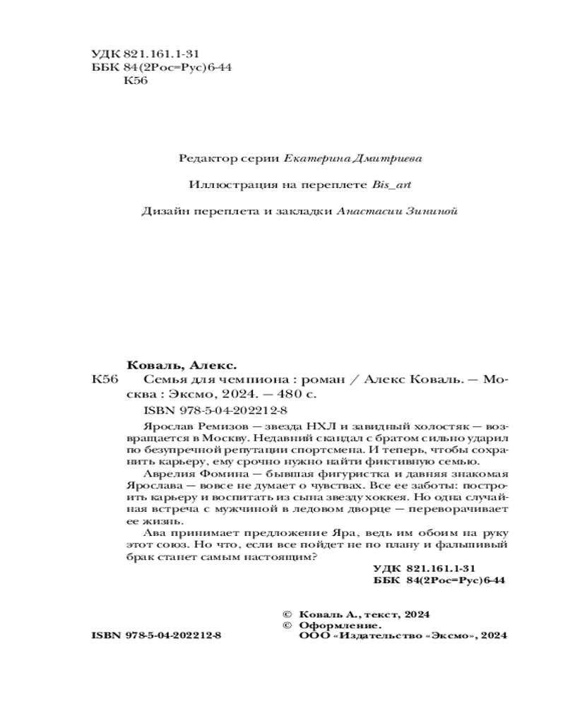 💳 Оплатить за товар можно при получении 🇰🇿 Есть бесплатная доставка по Казахстану от 1 дня 🎁 Копите бонусы с каждой покупки Серия: Невозможно устоять. Горячие романы Алекс Коваль Ярослав Ремизов — звезда НХЛ и завидный холостяк — возвращается в Москву. Недавний скандал с братом сильно ударил по безупречной репутации спортсмена. И теперь, чтобы сохранить карьеру, ему срочно нужно найти фиктивную семью. Аврелия Фомина — бывшая фигуристка и давняя знакомая Ярослава — вовсе не думает о чувствах. Все ее заботы: построить карьеру и воспитать из сына звезду хоккея. Но одна случайная встреча с мужчиной в ледовом дворце — переворачивает ее жизнь. Ава принимает предложение Яра, ведь им обоим на руку этот союз. Но, что, если все пойдет не по плану, и фальшивый брак станет самым настоящим? |